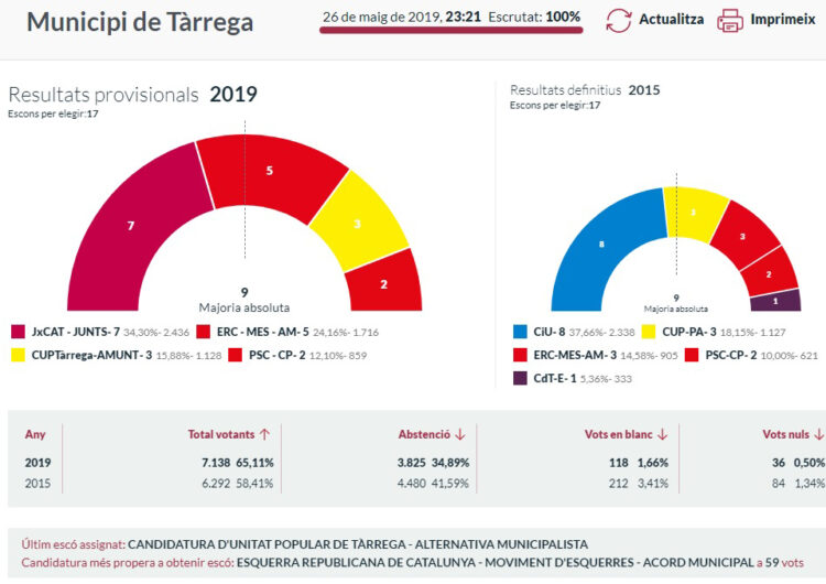 Perelló JxCAT, guanya amb 7 regidors però es queda a 2 de la majoria, ERC suma 2 regidors i n’obté 5 i la CUP I PSC mantenen 3 i 2 regidors respectivament.