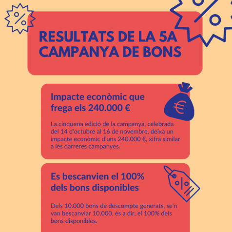 La cinquena edició de la campanya de bons de descompte impulsada per la Regidoria de Promoció Econòmica de Tàrrega ha estat de nou un èxit, ja que en aquesta ocasió, del 14 d’octubre al 16 de novembre, s’ha esgotat la totalitat dels 10.000 bons...