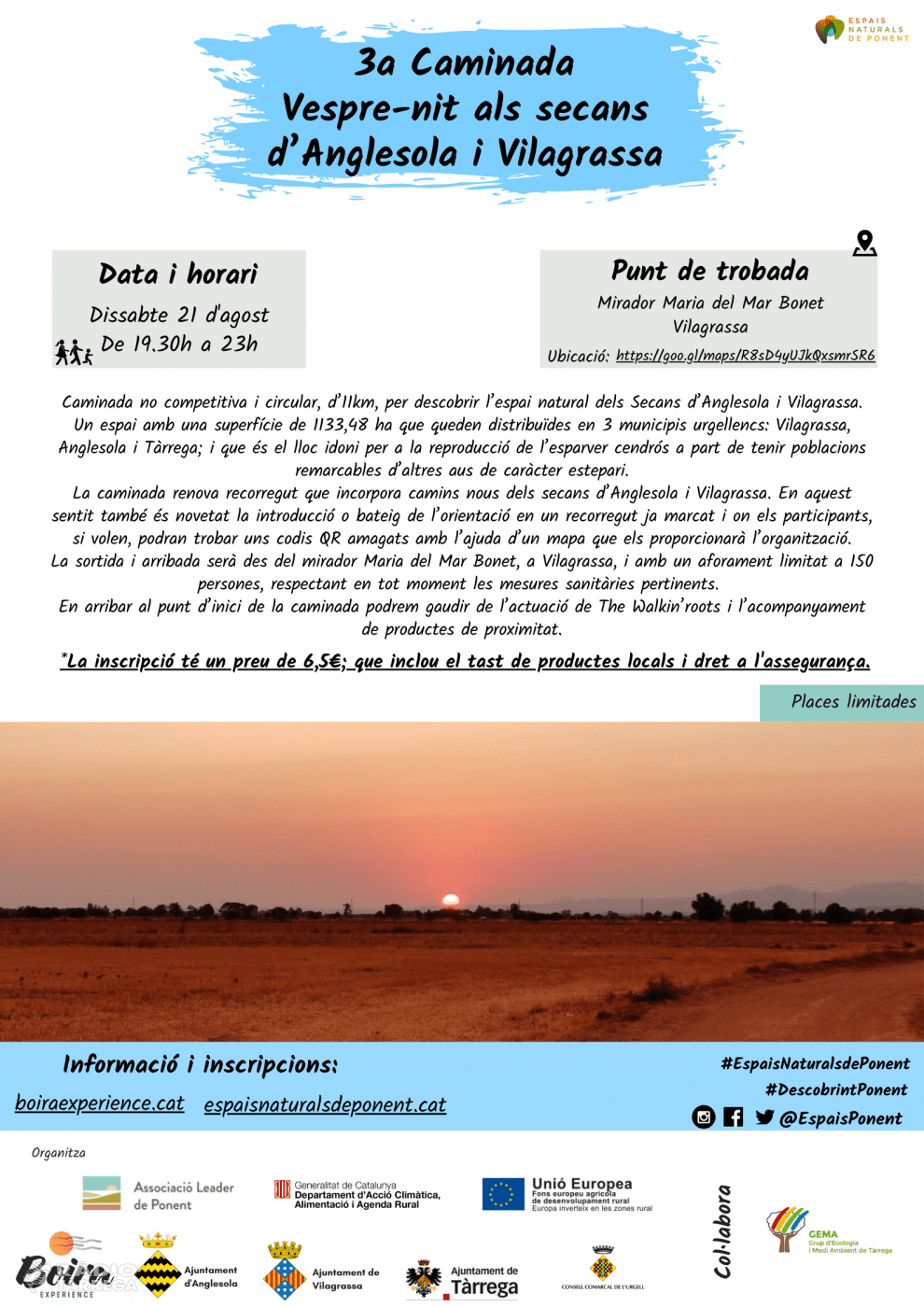 El proper dissabte 21 d’agost torna la “CAMINADA ALS SECANS D’ANGLESOLA I VILAGRASSA I BATEIG A LA ORIENTACIÓ, un esdeveniment de descoberta, de contacte amb la natura, esportiu no competitiu que adopta el nom a partir de la finalitat de l’activitat; descobrir els Secans d’Anglesola, Vilagrassa i Tàrrega, de nit. L’any 2021 l’organització ha introduït un bateig a la orientació com una activitat més de la caminada. Aquesta activitat està oberta a tothom que la vulgui practicar i només es necessita un telèfon mòbil i un mapa que la mateixa organització donarà.