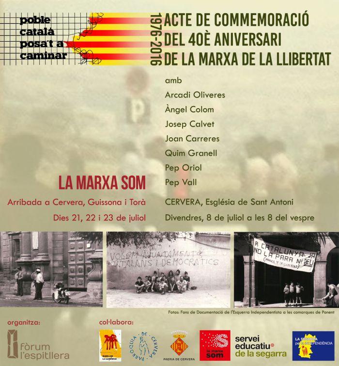 Per commemorar l’efemèride, el Fòrum l’Espitllera ha organitzat un acte commemoratiu a Cervera, aquest 8 de juliol a les 8 del vespre a l’església de Sant Antoni, amb la presència d’Arcadi Oliveres i Àngel Colom, artífexs de la Marxa juntament amb Lluís M. Xirinacs; Joan Carreres, impulsor i organitzador de l’acollida de la Marxa a Cervera; Josep Calvet, autor del llibre “Poble català, posa’t a caminar”; Pep Oriol i Quim Granell, autors d’una filmació clandestina de la Marxa a Cervera; i Pep Vall, a qui un grup d’ultradreta va cremar casa seva a Tàrrega. L’acte el presentà Joan Miquel Camacho.
