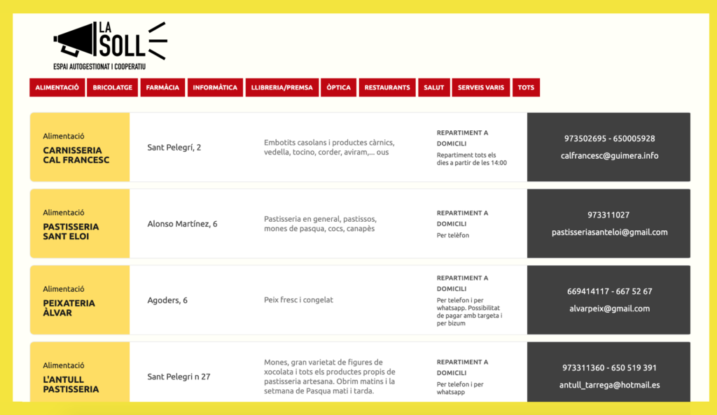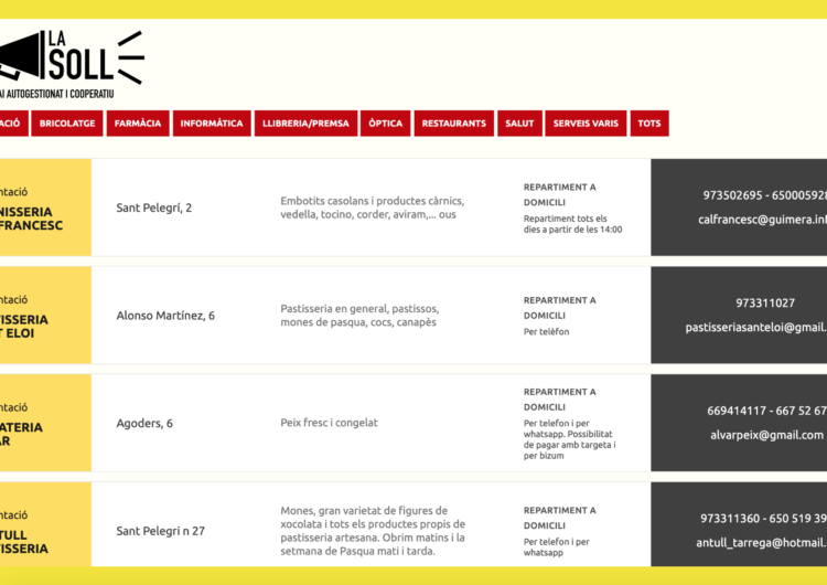 En aquest lloc web es poden filtrar els comerços pel tipus de serveis que ofereix (alimentació, farmàcia, òptica, informàtica, serveis varis, etc…) i també s’informa sobre els seus horaris i si realitza servei a domicili. Aquest últim punt està generant molt interès, ja que molta gent no sabia on trobar tots els serveis que ofereixen poden fer comandes on-line o per telèfon i aquest ha estat un dels motius pels quals La Soll s’ha ofert a fer aquest llistat.