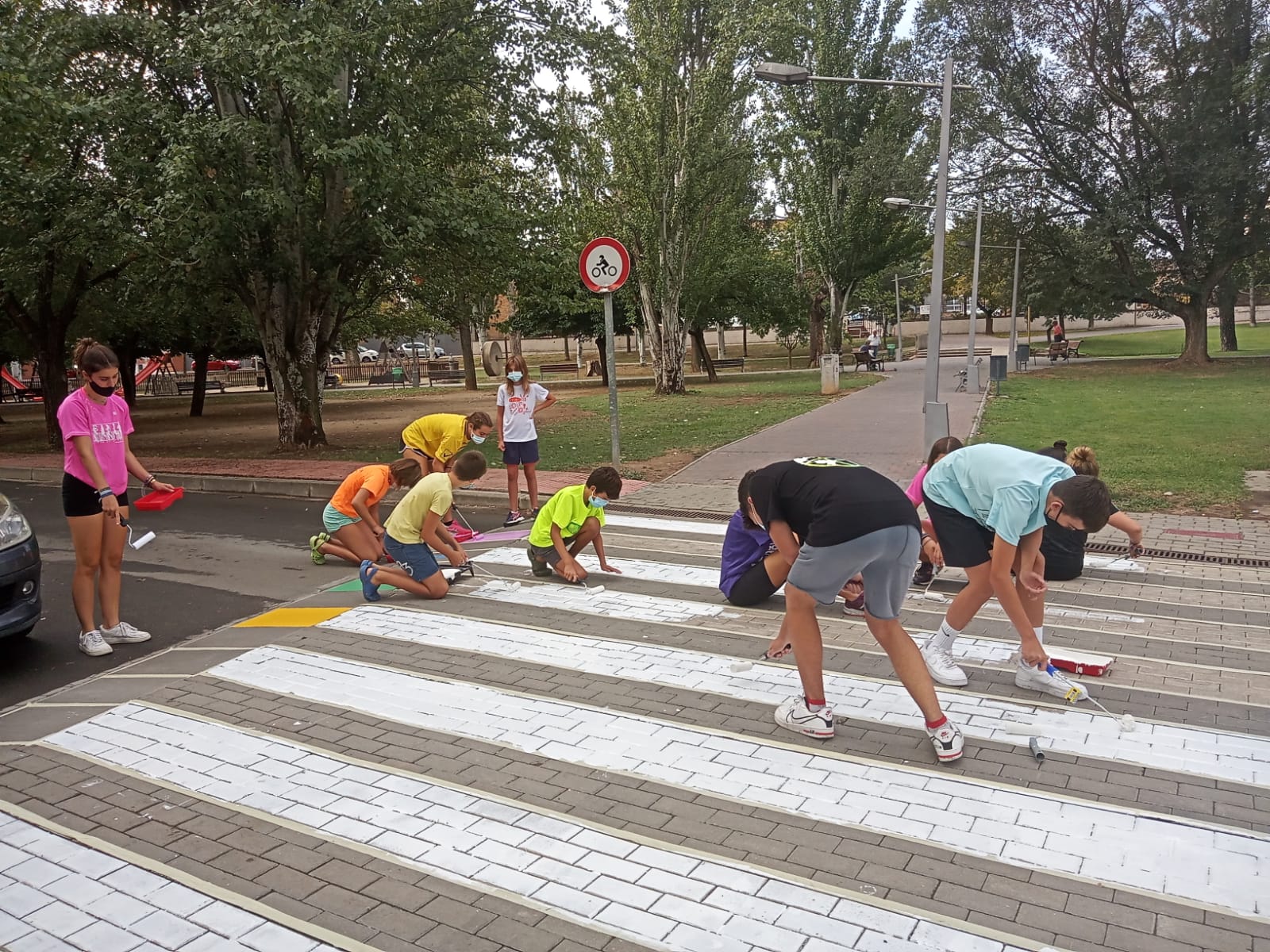 Foto: Un grup del joves participants repintant un dels passos de vianants.
