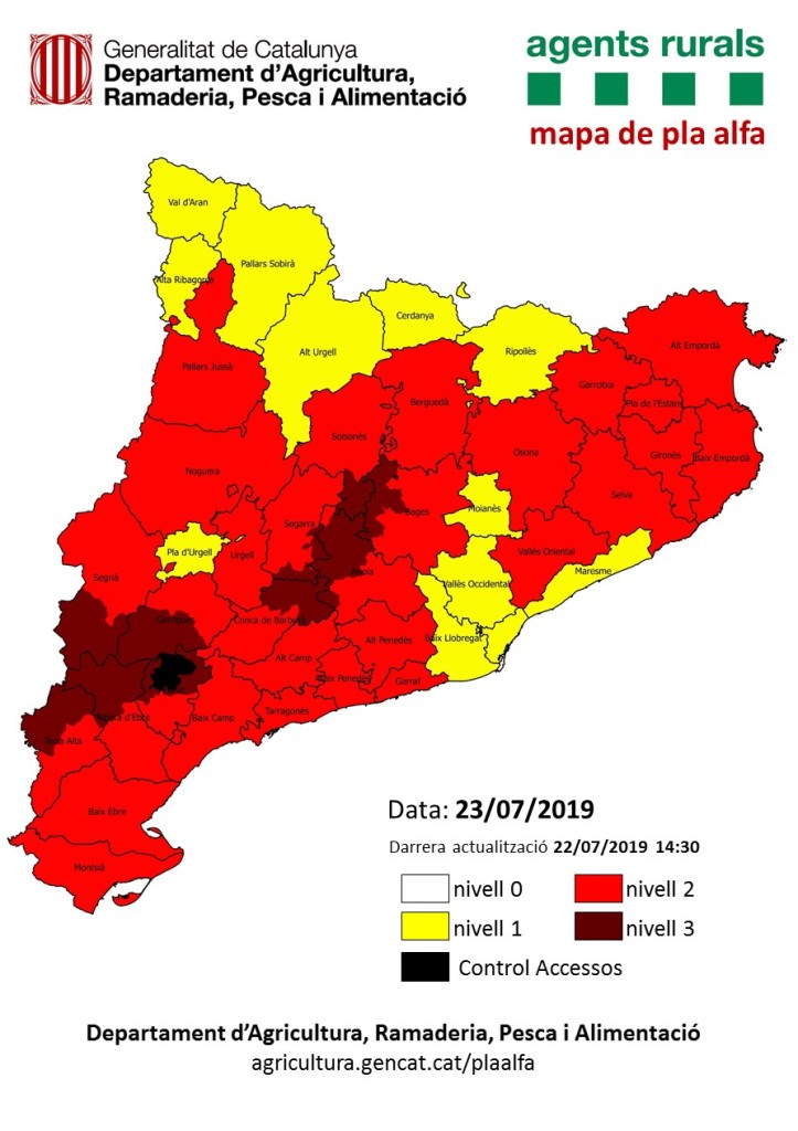 Davant l’increment del perill d’incendi forestal per l’augment de la temperatura i la disminució de la humitat relativa, a partir de demà dimarts, 23 de juliol, s’activarà el nivell 3 del Pla Alfa en un total de 73 municipis. D’aquests municipis, 32 corresponen a zones elevades de la Conca de Barberà, Segarra, Anoia , Bages i Solsonès, on encara s’està segant i 41 són termes municipals de les comarques de la Terra Alta, Ribera d’Ebre, Segrià , Garrigues, Priorat, que presenten un estat de sequera acumulada, i que poden veure’s més afectades per les difícils condicions meteorològiques. Els accessos al Parc Natural de la Serra de Montsant estaran restringits a partir de demà matí.
