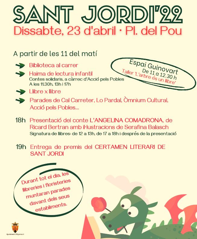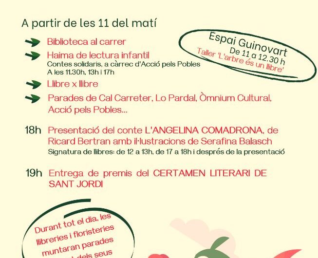 La diada de Sant Jordi, que se celebra a tot Catalunya el dissabte 23 d’abril, com en anys anteriors es farà al carrer, concretament a la plaça del Pou. Durant el matí, s’habilitarà un espai de lectura infantil, es farà intercanvi de llibres, la biblioteca també sortirà al carrer i a la plaça hi hauran parades d’entitats i associacions. L’entitat Acció pels pobles explicarà contes solidaris al llarg del dia. Concretament, aquestes sessions es faran a les 11.30 h, a les 13 h i a les 17 h. A més, durant tot el dia les llibreries i les floristeries locals muntaran la seva parada davant els seus establiments.A les sis de la tarda, a la plaça del Pou, es farà la presentació del conte