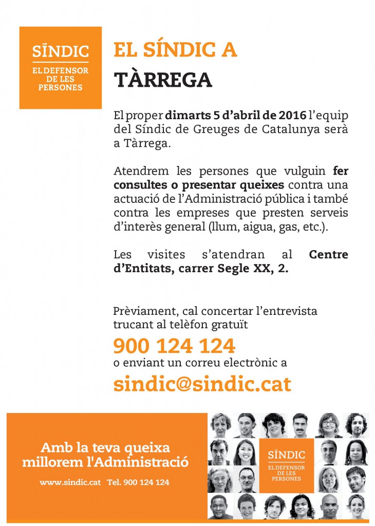 Una delegació del Síndic de Greuges de Catalunya es desplaçarà fins a Tàrrega el proper dimarts 5 d’abril per atendre presencialment les persones que vulguin formular consultes o exposar les seves queixes en relació a les administracions públiques i les empreses que presten serveis d’interès general (llum, aigua, gas). L’acció s’emmarca dins un conveni de col·laboració signat entre el Síndic i l’Ajuntament de Tàrrega amb la finalitat de potenciar la defensa dels drets de la ciutadania. El punt d’atenció s’ha fixat al Centre d’Entitats (Carrer del Segle XX, 2). Prèviament, cal concertar l’entrevista trucant al telèfon gratuït 900 124 124 o enviant un correu a l’adreça electrònica: [email protected]