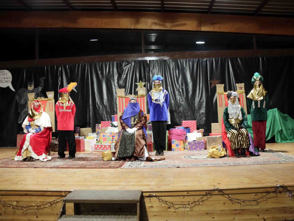 Pla general de les tres Reines d’Orient a l’escenari del poliesportiu de Belianes abans de repartir els regals als nens i nenes del municipi, el 5 de gener de 2020. (Horitzontal)
