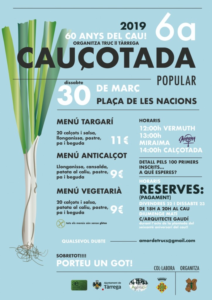 WhatsApp Image 2019-03-18 at 12.26.27Aquest 2019 el CAU de Tàrrega celebra la 6a Calçotada Popular organitzada pels Truc II. L’esdeveniment tindrà lloc a la Plaça de les Nacions de Tàrrega el dia 30 de març. La calçotada, que pretén aglutinar gent de totes les edats segons l’organització, començarà a les 12h del migdia amb un vermut a l’aire lliure. Tot seguit, als volts de les 14h, començarà una calçotada on tothom tindrà un dels menús que s’ofereixen.