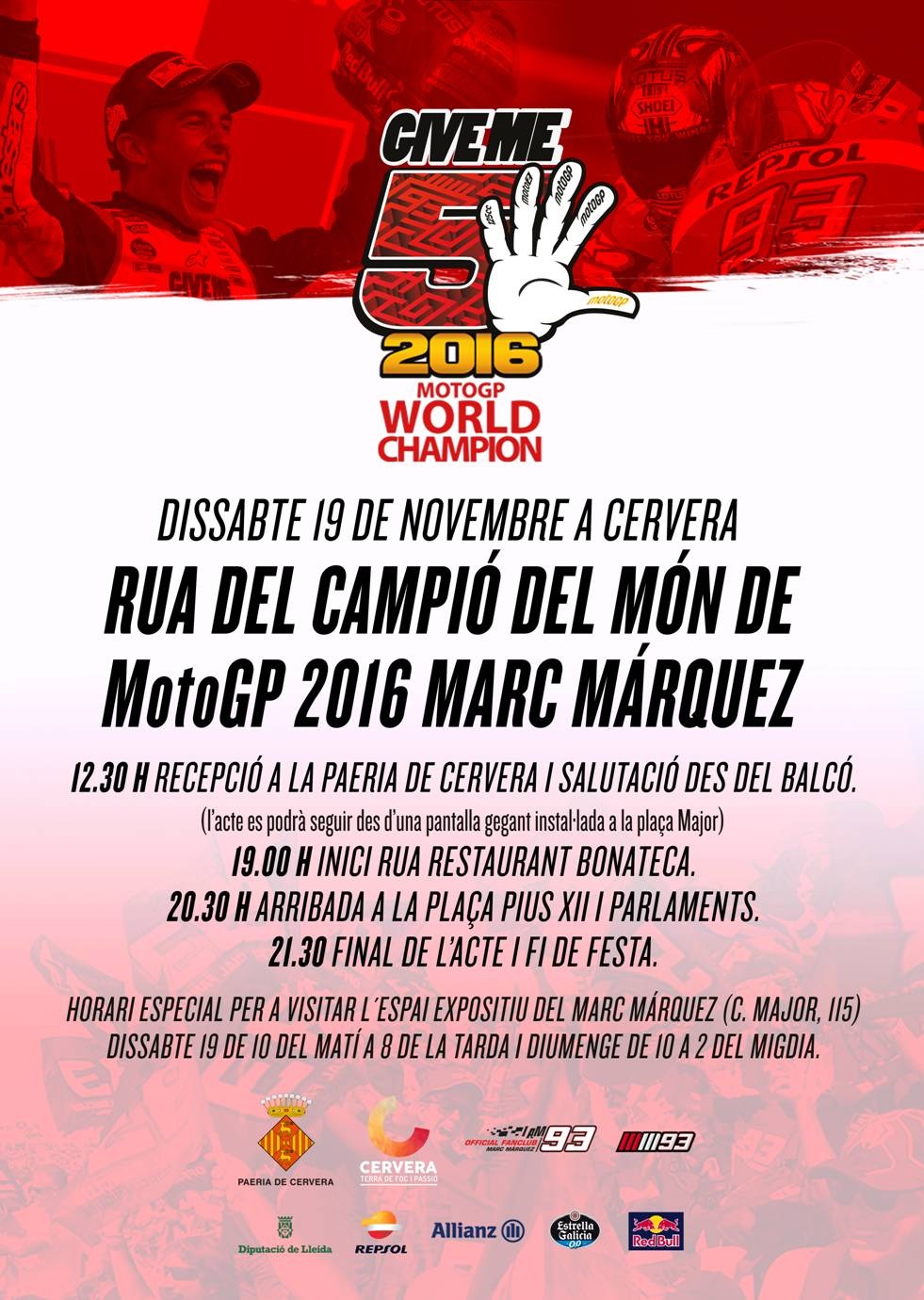 Després de l’acte protocol·lari, Marc Márquez sortirà al balcó de la Paeria a saludar els aficionats que s’apleguin a la plaça Major. Els Geganters de Cervera li oferiran un ball d’honor dels gegants de la ciutat i els Campaners de Cervera li dedicaran un toc de les campanes de Santa Maria.