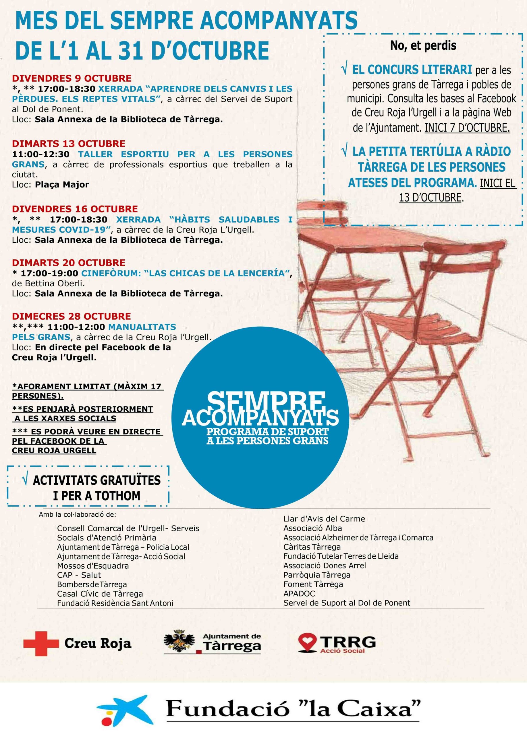 El divendres 9 d’octubre s’inicia el cicle amb la xerrada “Aprendre dels canvis i les pèrdues. Els reptes vitals” a càrrec del Servei de Suport al Dol de Ponent (5 tarda, Biblioteca). Durant el matí del dimarts 13 d’octubre s’impartirà un taller esportiu per a persones grans a la plaça Major. La següent cita arribarà el divendres 16 d’octubre amb una xerrada sobre hàbits saludables i mesures de prevenció contra la Covid-19 (5 tarda, Biblioteca). El cinema prendrà el relleu el dimarts 20 d’octubre oferint la projecció del film “Las chicas de la lencería” (5 tarda, Biblioteca). Finalment, el dimecres 28 d’octubre, a les 11 de matí, s’impartirà un taller de manualitats en una emissió en directe a través de Facebook. Totes les activitats són gratuïtes.