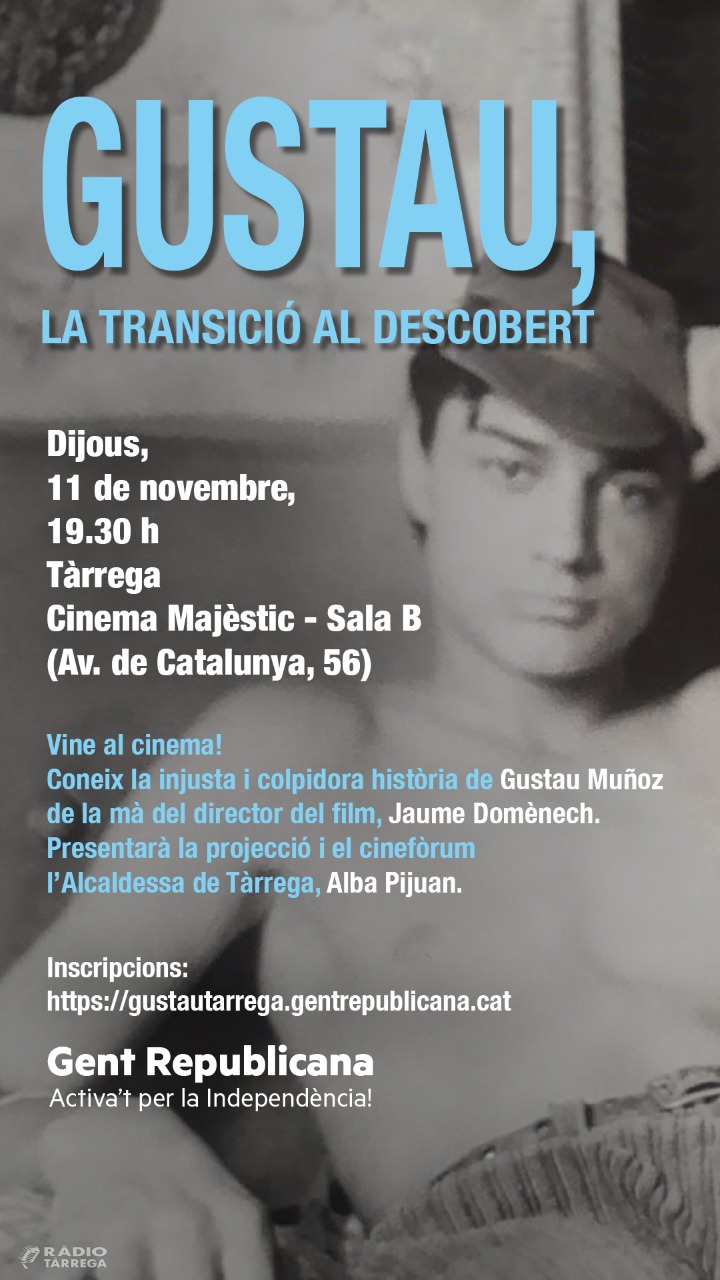 Aquest dijous 11 de novembre a dos quarts de vuit del vespre hi haurà la presentació a Tàrrega del film ‘Gustau, la Trancisió al descobert’ a càrrec del seu director Jaume Domènech i amb la participació de l’alcaldessa Alba Pijuan Vallverdú als cinemes Majèstic de la capital de l’Urgell.