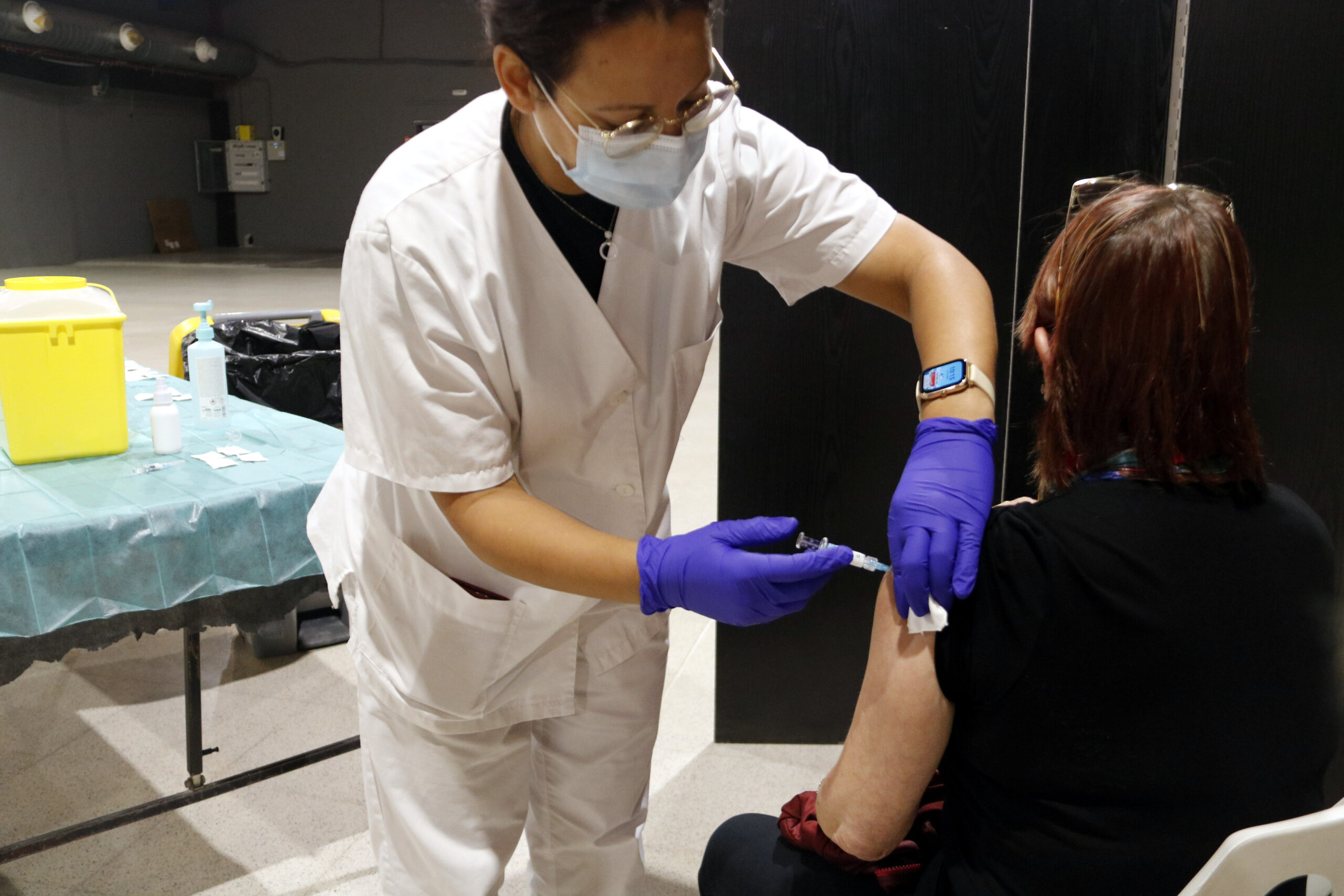 Pla mitjà on es pot veure una sanitària administrant una vacuna de la grip a una dona a l’Espai MerCat de Tàrrega, el 25 d’octubre de 2021. (Horitzontal)