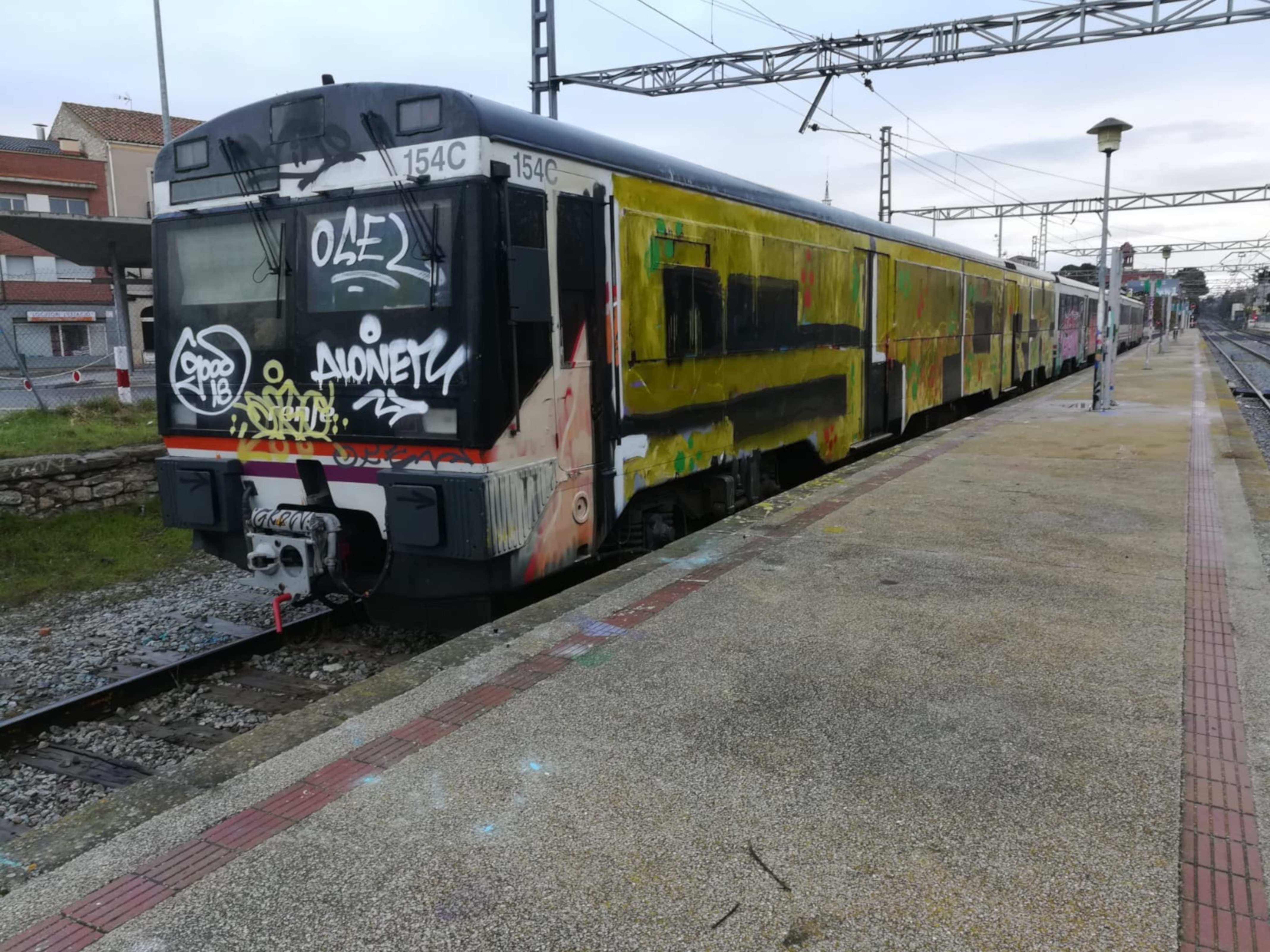 Tren pintat completament pels grafiters a l’estació de Cervera. Imatge del 25 de novembre del 2018. (Horitzontal)