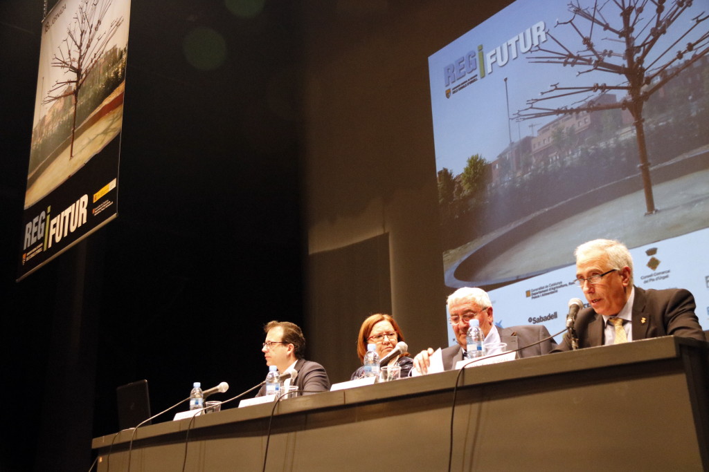 Pla mitjà on es pot veure la taula institucional de la inauguració de la 18ena Jornada Reg i Futur, a Mollerussa, el 22 de febrer de 2019. (Horitzontal)