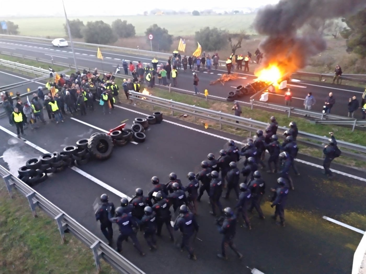 Al voltant de dos quarts de vuit han arribat sis furgonetes antidisturbis dels Mossos d’Esquadra, que després d’avisar, han intervingut desallotjant els manifestants de la calçada.