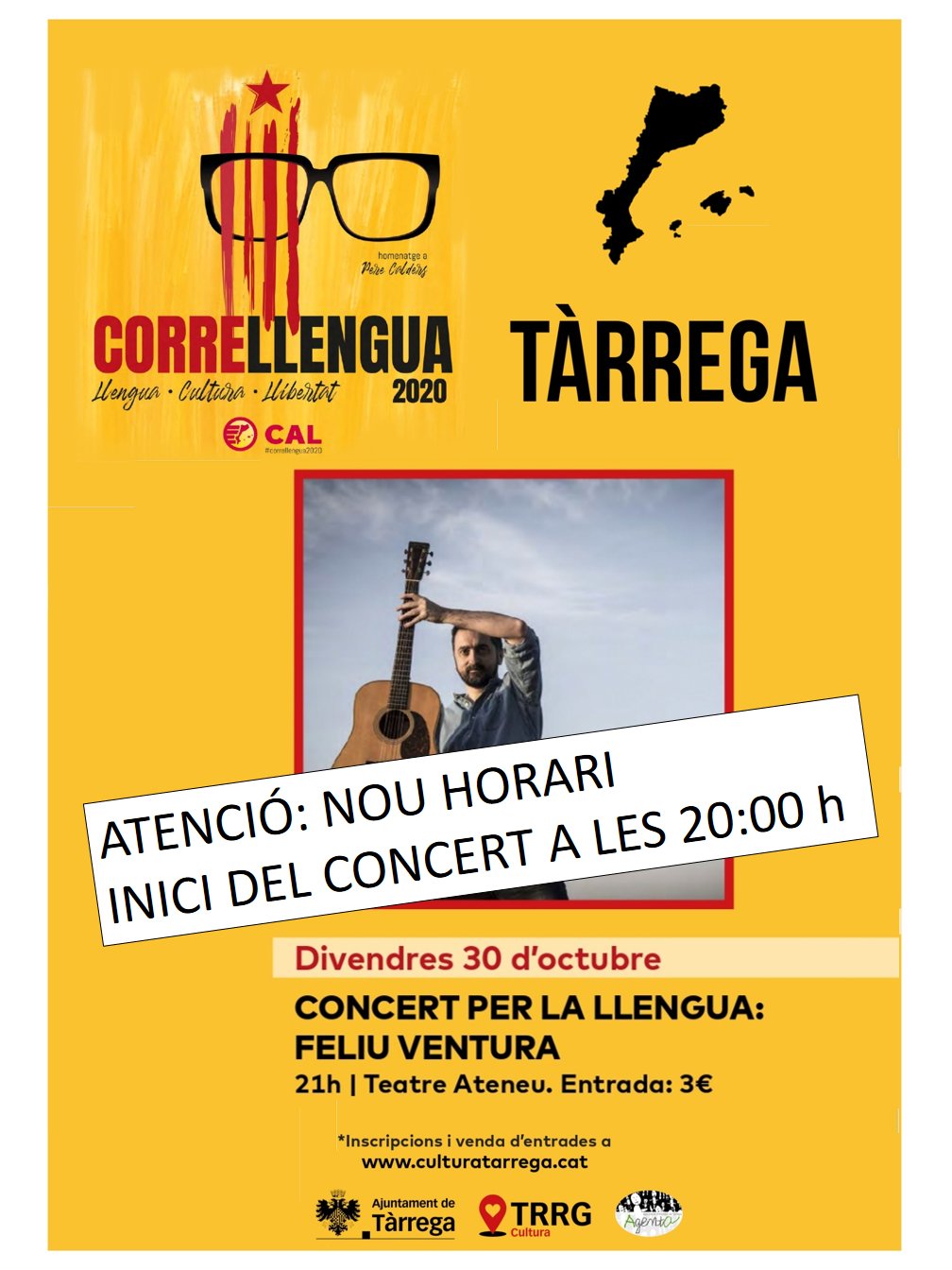 El concert del cantautor Feliu Ventura en el marc del Correllengua, previst per divendres vinent 30 d’octubre al Teatre Ateneu, s’avança a les 8 del vespre (estava inicialment programat a les 21h). Les entrades són a la venda al preu de 3 euros al web www.culturatarrega.cat. L’artista valencià presentarà les cançons del seu darrer treball, titulat “Convocatòria”. Val a recordar que l’aforament del Teatre Ateneu ja es reduí des del passat setembre al 50% de l’aforament. La següent activitat del Correllengua, la presentació del llibre de la lingüista Carme Junyent, es manté per al divendres 13 de novembre, a les 8 del vespre, a la Casa Consistorial.