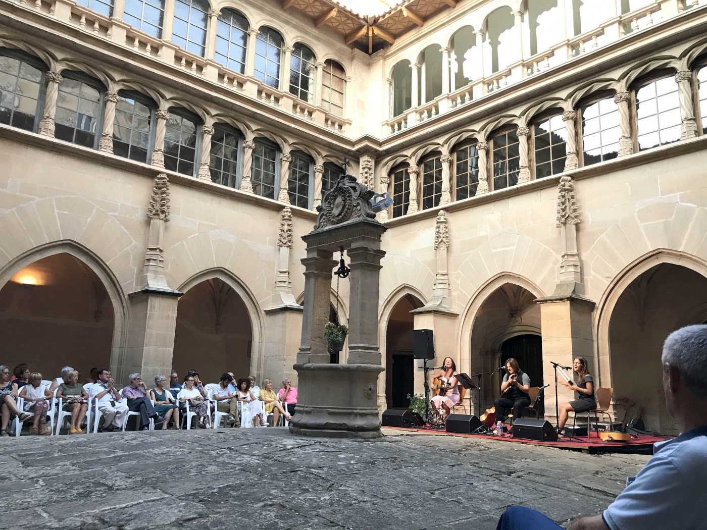 El claustre del Convent de Sant Bartomeu de Bellpuig va acollir ahir més de 120 persones que van poder gaudir d’una hora i mitja de concert amb Les Kol•lontai, el quartet femení format per Meritxell Gené, Montse Castellà, Sílvia Comes i Ivette Nadal (que ahir no va poder ser a l’actuació), que presentaven a Bellpuig el seu disc ‘Cançons Violeta’ en el qual posen música a poemes, paraules i reflexions fetes per dones.