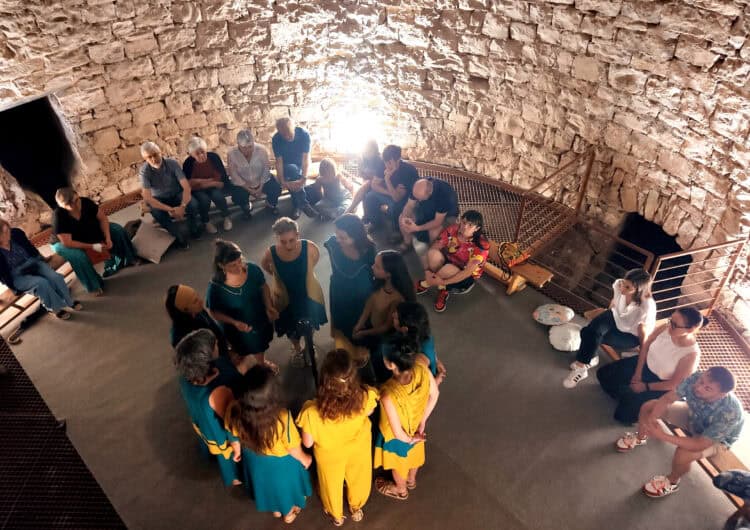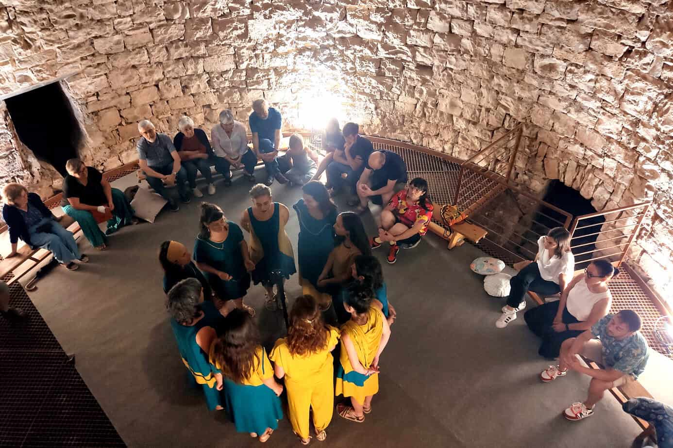 En aquest insòlit escenari, les deu components de la formació van desgranar el seu repertori de melodies del cançoner popular català arranjades segons les maneres antigues que tenia el poble de cantar a veus (i sovint sense coneixements musicals). El públic, en grups reduïts i distribuïts en quatre passis, va gaudir així de les polifonies ‘accapella’ al llarg d’un viatge musical i etnològic cap a les arrels dels sons tradicionals. El recital de Galindaina es va acompanyar de degustacions de vi.