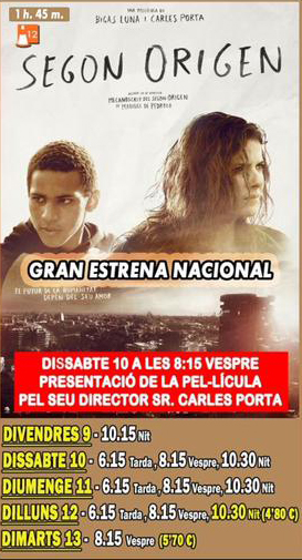 Cinemes Majèstic de Tàrrega projecten durant tot aquest cap de setmana el film Segon origen, adaptació a la gran pantalla de la popular novel·la de Manuel de Pedrolo escrita l’any 1974. El conegut cineasta Bigas Luna inicià la producció però la seva mort l’any 2013 motivà que agafés les regnes de realització el productor lleidatà Carles Porta, també periodista i escriptor. Carles Porta serà a Tàrrega per a presentar personalment el film en la sessió del dissabte 10 d’octubre a les 20:15h. L’estrena a la capital de l’Urgell guarda simbolisme ja que Manuel de Pedrolo residí a la ciutat durant molts anys de la seva vida. Val a dir que la protagonista del llibre du per nom Alba, fet que molts consideren una referència a Tàrrega (la Mare de Déu de l’Alba és la patrona de la localitat).