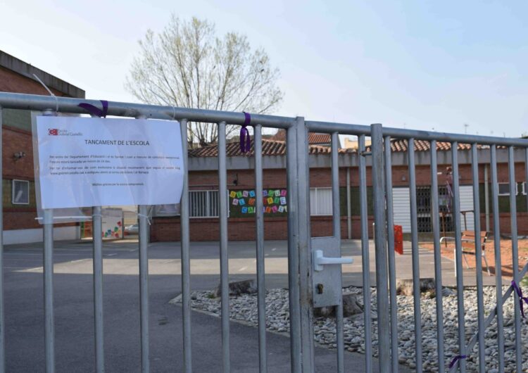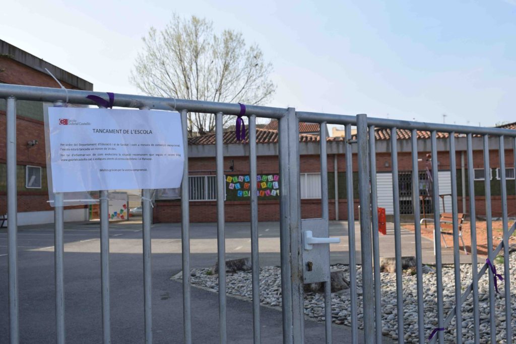 Una escola d’Igualada amb un rètol en què s’informa del tancament, el 13 de març del 2020 (horitzontal).