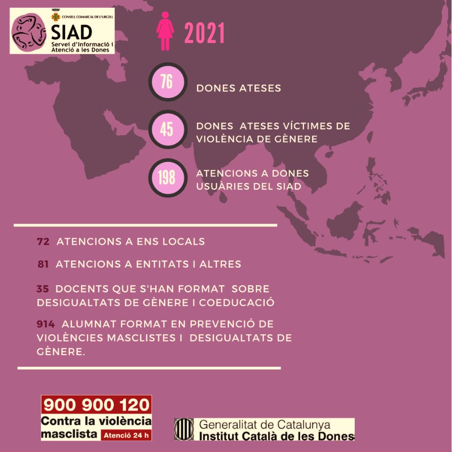 Cal tenir en compte que l’any 2020, el SIAD de l’Urgell va atendre 44 dones, 20 de les quals eren víctimes de violència de gènere, per tant s’han duplicat les dones ateses per violència masclista respecte de l’any anterior. Aquest augment s’atribueix al fet que les dones víctimes d’aquestes violències cada vegada acudeixen més a la recerca d’informació i ajut per al problema que pateixen. Aquestes dades mostren que cal continuar treballant en la seva atenció i, també, en la prevenció i la sensibilització de les violències masclistes i les desigualtats de gènere.