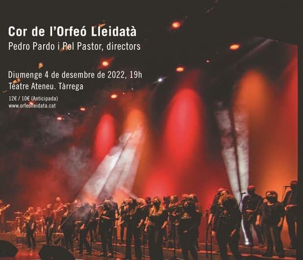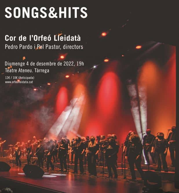 L’espectacle més exitós de l’Orfeó Lleidatà, amb més de 8.000 espectadors a Lleida en vuit anys consecutius, arriba a Tàrrega ple d’energia positiva, emmarcat en el Cicle Coral de Tardor, i continua revolucionant la música coral incorporant grans èxits del pop, rock i gòspel, sense oblidar les trencadores versions de clàssics nadalencs com Fum, fum, fum i El noi de la mare. Amb Songs & Hits, l’Orfeó Lleidatà arriba ple d’energia positiva, i ens traslladarà a un món de cançons pop, rock i gòspel, repassant alguns dels HITS més importants dels darrers 50 anys,d’artistes com Elton John, Bee Gees, Earth Wind and Fire o Village People entre altres.