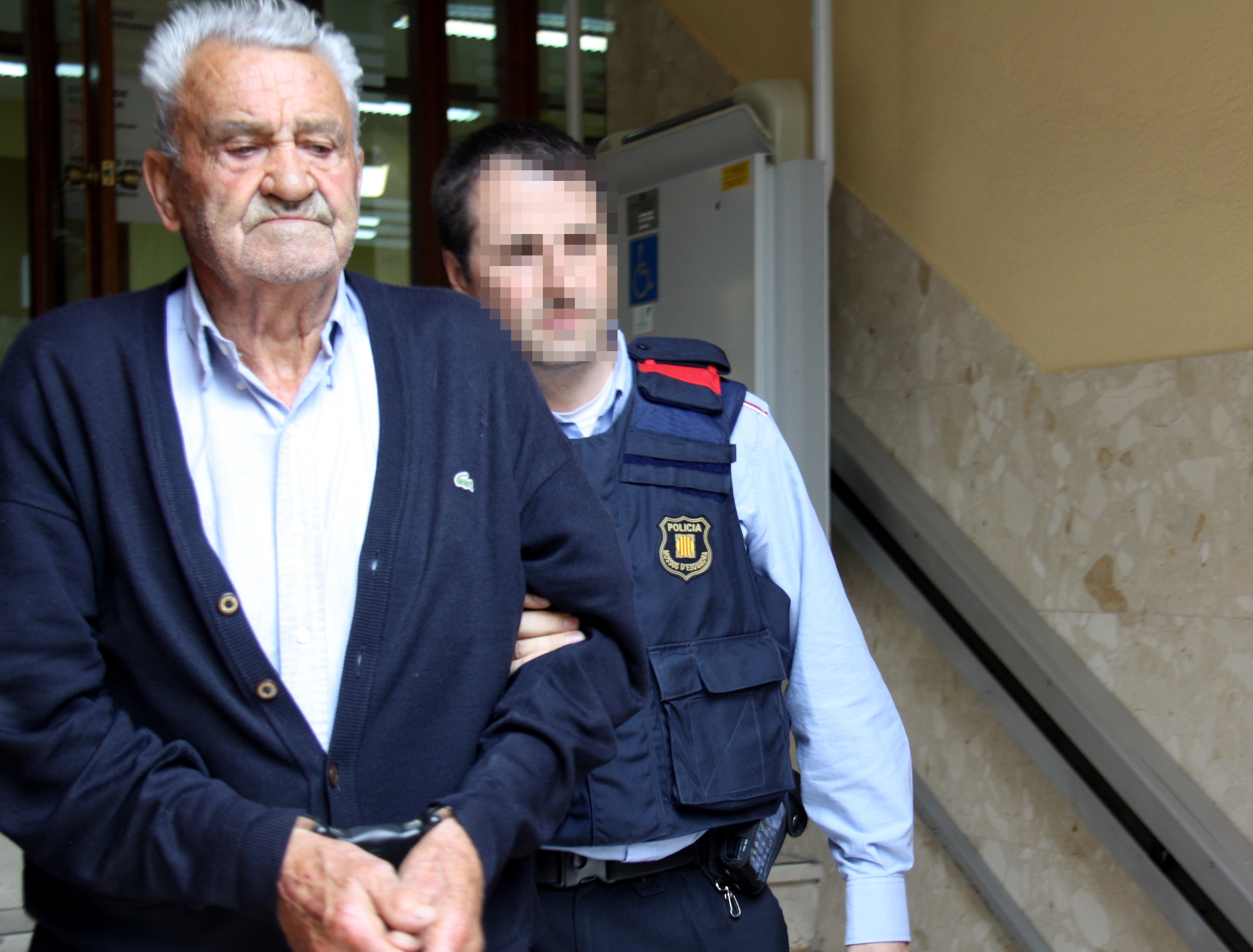 Pla mig del veí de Bellpuig acusat de matar el seu gendre sortint dels jutjats de Cervera per ser traslladat a la presó, l’1 d’abril de 2016. (Horitzontal)