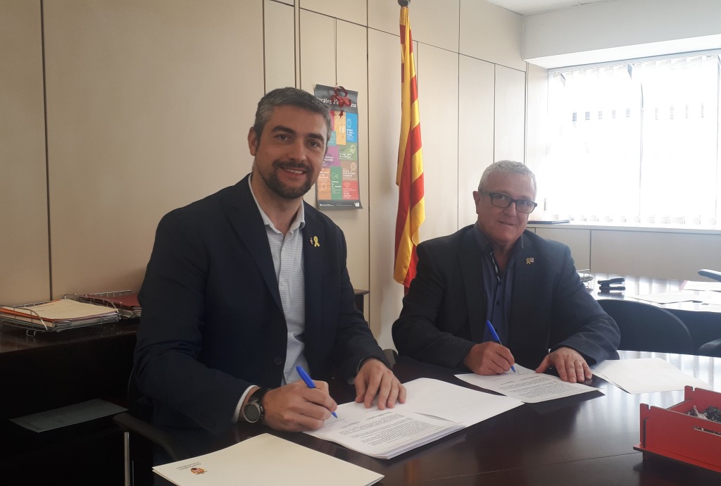 Peu de foto:Bernat Solé i Ramon Simon signant el conveni.