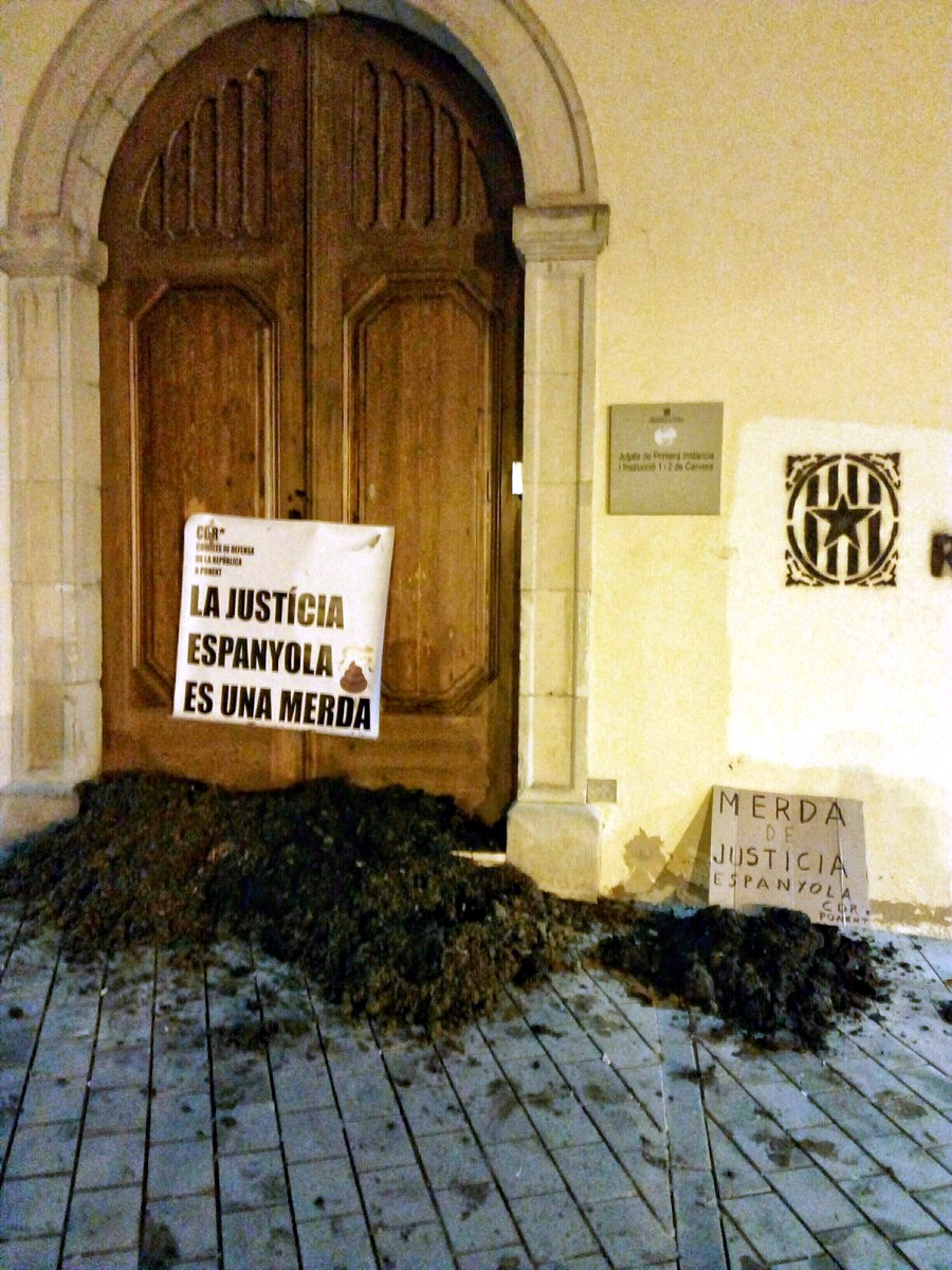 ACN Lleida .- Els CDR han tornat a escampar escombraries i fems a les portes dels jutjats de diversos municipis catalans. En aquest cas ho han fet als de Lleida, Cervera i Balaguer. Denuncien que la “injustícia” espanyola “té presos polítics i exiliats, bloqueja lleis i provoca vagues de fam”, han escrit al seu twitter. “No acceptem aquest sistema judicial pudent”, han afegit. Al de Lleida han desplegat una pancarta on es podia llegir “La justícia espanyola és una merda”. És la tercera vegada que els CDR escampen brossa a portes de jutjats catalans.