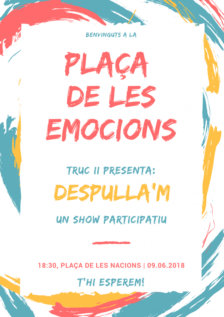 Durant aquest acte exterior, públic i gratuït aprofitarem per presentar el nostre projecte, anomenat “Despulla’m”, tot transformant l’espai de la plaça de les Nacions amb “la plaça de les Emocions”. Aquest projecte consisteix en desfer-nos dels mals hàbits, costums i necessitats primer-mundistes donant pas a quelcom molt més important, la felicitat. Per aconseguir-ho, ens basem en potenciar els valors que ens fan millors persones i més humanes, mitjançant l’esforç, la conscienciació personal i el compromís amb la societat. Pensem doncs, que la felicitat radica en despullar-nos, ser nosaltres mateixos i estimar-nos tal com som.