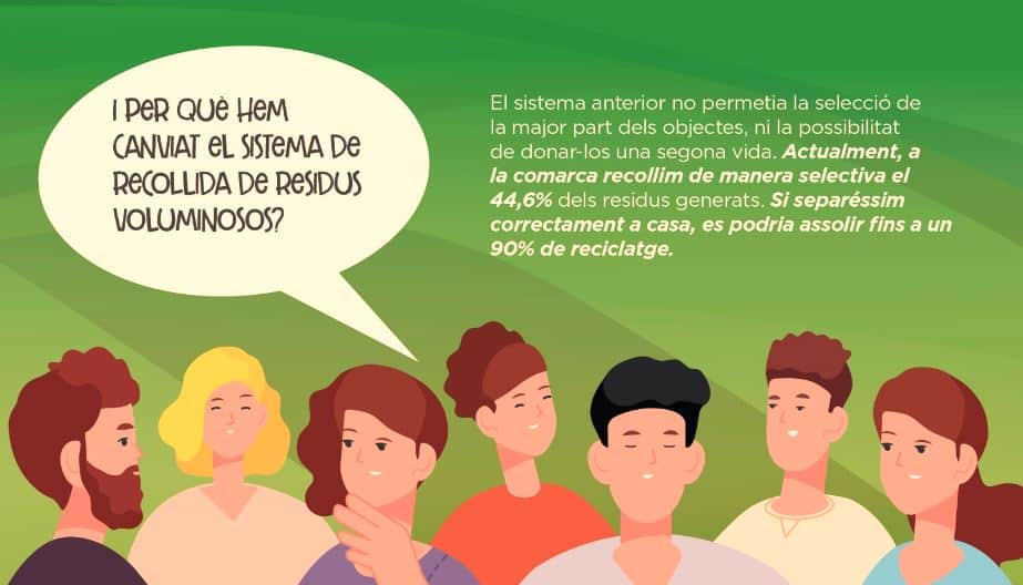 En paral·lel a aquest nou sistema, s’han plantejat millores dels serveis complementaris, alineades amb els objectius comarcals que es posaran en funcionament entre el 2022 i el 2023. En concret, ara es posa en marxa el servei de recollida de voluminosos a demanda, posant a la disposició dels ciutadans el número de telèfon 621 192 828 per tal que els usuaris puguin trucar, identificar-se, explicar-nos els residus que volen que els recollim i pactar el dia, l’hora i el lloc on recollir-los, que generalment serà a l’ illa de contenidors més propera al ciutadà.