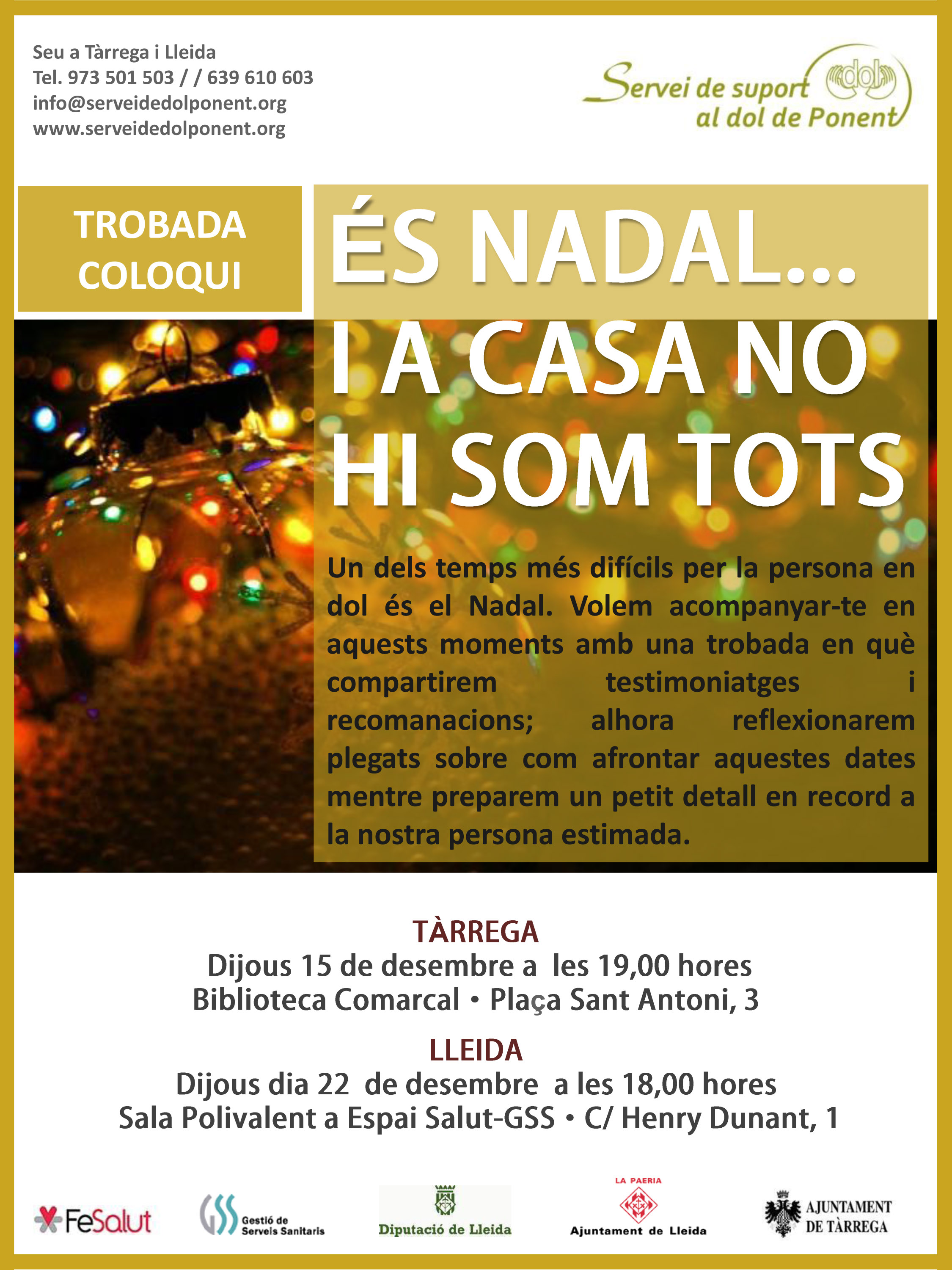 Un dels temps més difícils per la persona en dol és el Nadal. El Servei de Suport al Dol de Ponent organitza aquesta conferència-taller que té per objectiu donar suport social a persones que estan vivint una pèrdua per mort i necessiten suport per afrontar els primers Nadals. Presentarem recomanacions i reflexionarem plegats sobre com afrontar aquestes dates. Durant el taller, es crearà una senzilla manualitat nadalenca en record a les persones que ja no hi són amb nosaltres.