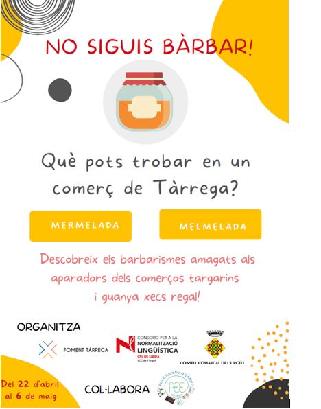 El passat 6 de maig es va dur a terme el sorteig de la gimcana lingüística ‘No siguis bàrbar’, organitzada per Foment Tàrrega i el Servei de Català del Consorci per a la Normalització Lingüística amb la col·laboració del Pla d’Entorn de Tàrrega i el Consell Comarcal de l’Urgell.