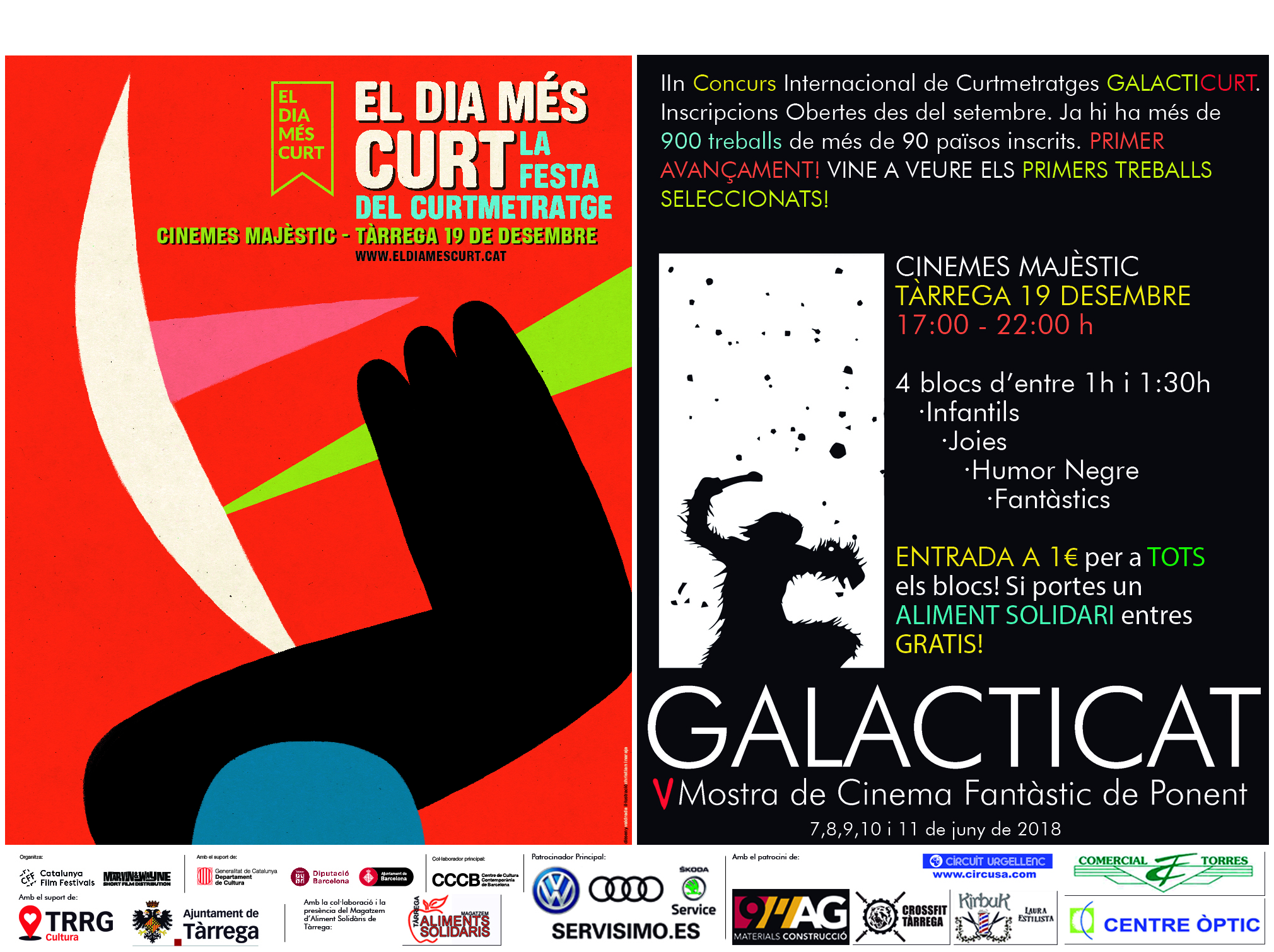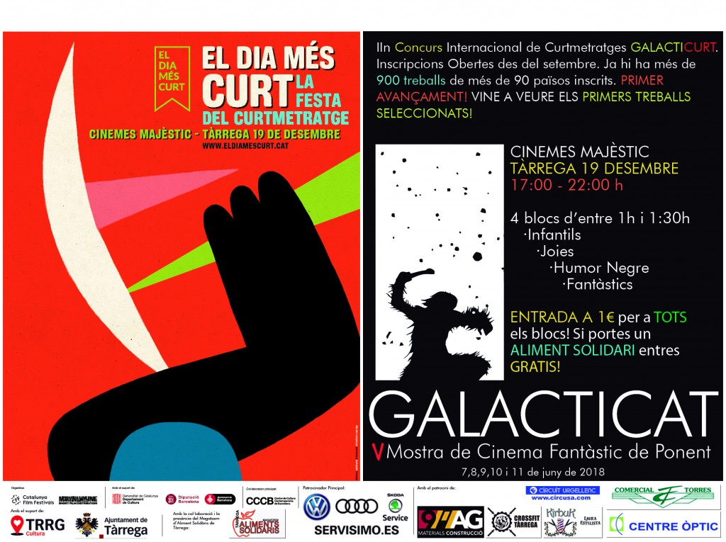 Els propers dies 19 i 20 de desembre de 2018 celebrem el Festival internacional de Curtmetratges EL DIA MÉS CURT i un avançament del IIn Concurs de Curtmetratges GALACTICURT que està emmarcat dins la Vª MOSTRA DE CINEMA FANTÀSTIC i de TERROR de PONENT – GALACTICAT, que tindrà lloc els propers dies 7,8,9,10 i 11 de juny de 2018.