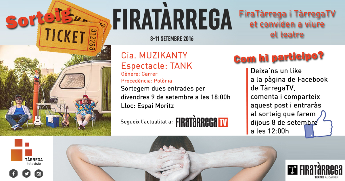 FiraTàrrega i TàrregaTV et conviden a viure el teatre. El proper dijous 8 de setembre sortegem dues entrades per a l’espectacle TANK de la companyia Muzikanty.