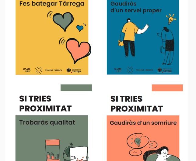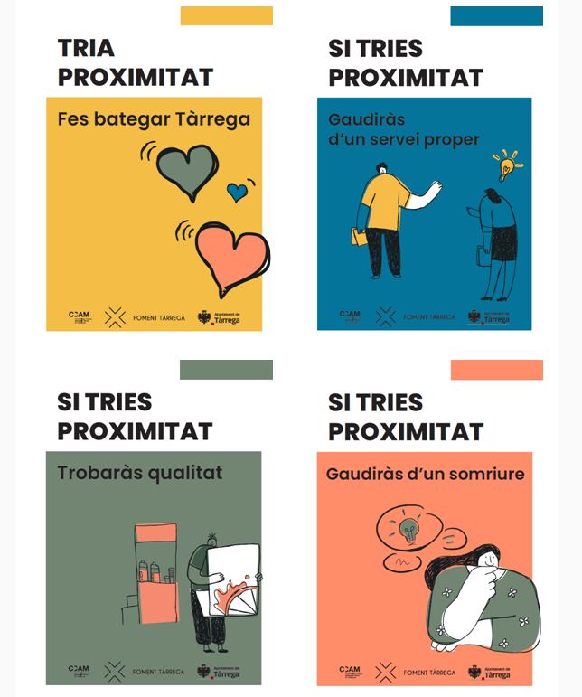 L’Associació de comerços i serveis de Tàrrega, Foment Tàrrega, presenta la campanya “Tria Proximitat”, amb els següents eslògans: “Tria proximitat, fes bategar Tàrrega”, “Si tries proximitat, consumiràs de forma sostenible”, “Si tries proximitat, t’assessoraran” , “Si tries proximitat, donaràs vida a Tàrrega”, “Si tries proximitat, trobaràs el que busques”, “Si tries proximitat, gaudiràs d’un servei proper”, “Si tries proximitat, trobarà qualitat” i “Si tries proximitat, gaudiràs d’un somriure”.
