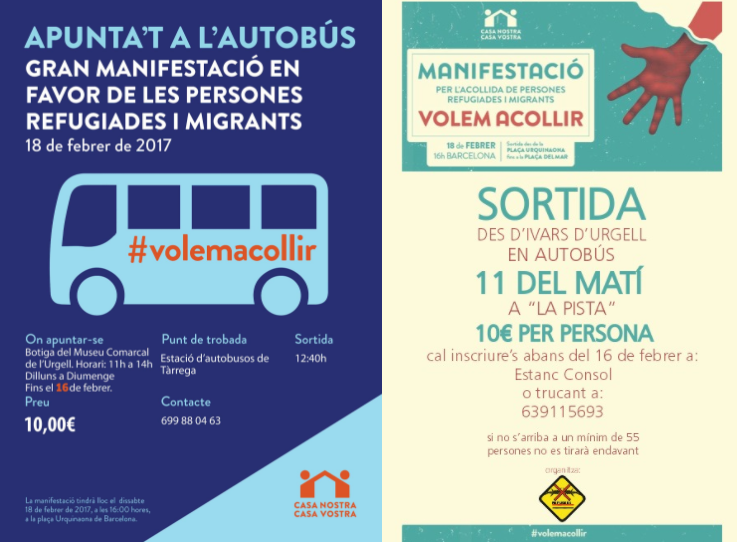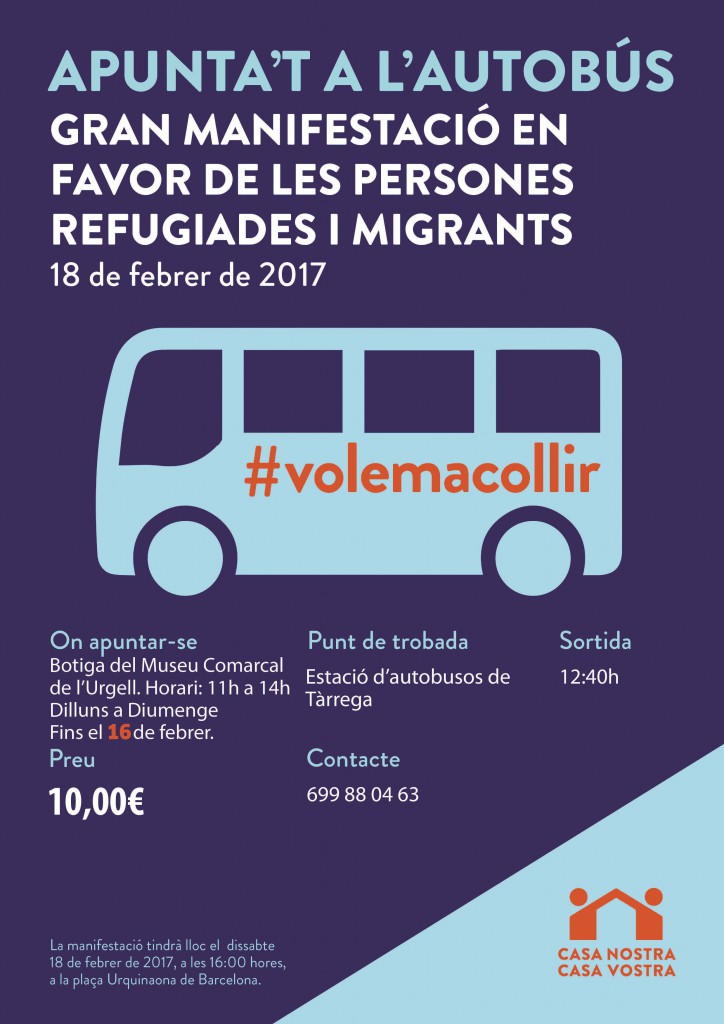 En el marc de la campanya ‘Casa nostra, casa vostra’, el dia 18 de febrer a les 16h, a Pl.Urquinaona (Barcelona), tindrà lloc una gran manifestació en favor de l’acollida de persones refugiades i migrants. Hem de ser-hi tots! Hem de ser-hi ara!