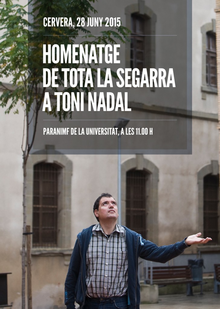 La ciutat de Cervera acollirà el pròxim diumenge dia 28 de juny un acte d’homenatge a Toni Nadal, coincidint amb el tercer aniversari del seu comiat. Institucions i entitats de la comarca de la Segarra (entre les quals s’hi compten el Fòrum l’Espitllera, els Diables Carranquers i els Geganters de Cervera, entitats de les que fou membre molt actiu) i companys seus de Televisió de Catalunya, han decidit fer aquest acte de reconeixement a la figura d’aquest geògraf i home del Temps de Tv3, natural de Cervera. Primer, per la seva tasca professional i divulgativa de la climatologia, del paisatge i del territori, que tant apreciava, especialment el de la seva comarca. I segon, pel seu tarannà, que el va fer sempre una persona estimada i entranyable entre tota la població per les seves participacions i col.laboracions en entitats i associacions cerverines i segarrenques. L’acte se celebrarà a les 11 del matí al Paranimf de la Universitat de Cervera. Hi haurà un seguit d’intervencions per glossar la seva trajectòria a nivell professional, i també en l’àmbit personal, i s’anunciaran un seguit d’iniciatives proposades pels organitzadors de l’acte amb l’objectiu fonamental de preservar entre nosaltres la seva memòria per la feina feta i per la seva actitud , perquè especialment les generacions futures puguin conèixer el seu treball i la seva dedicació envers la comarca de la Segarra. La jornada es clourà amb les actuacions dels Geganters i dels Carranquers de Cervera, dues entitats de les quals , Toni Nadal en formava part i n’era membre actiu. Possiblement mai, a casa nostra, un acte d’homenatge havia generat un consens tant ampli alhora de tirar-lo endavant. Un maleït accident de muntanya, ara fa tres anys ,ens el va pendre d’entre nosaltres, però a partir d’aquest 28 de juny continuarà més present que mai en el nostre imaginari personal i col.lectiu.