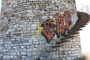 Concretament, es tracta de dues pintades de gran format, que es poden veure des de l’exterior de la torre, més diverses pintades interiors. Als grafits exteriors s’hi pot veure una pintada paral·lela a les escales d’accés a la torre, on s’hi pot llegir ‘Sebok’; també n’hi ha una de més petita amb tres lletres ‘CHP’. A part, hi ha una tercera pintada molt menor que sembla una possible firma. A la part interior hi ha pintat un rostre i diverses firmes.