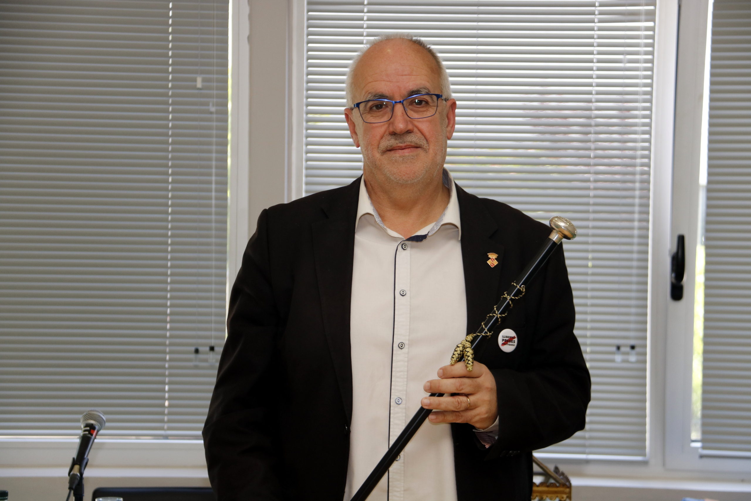 Pla mitjà on es pot veure el nou paer en cap de Cervera, Joan Santacana, amb la vara d’alcalde, el 12 de juny de 2020. (Horitzontal)