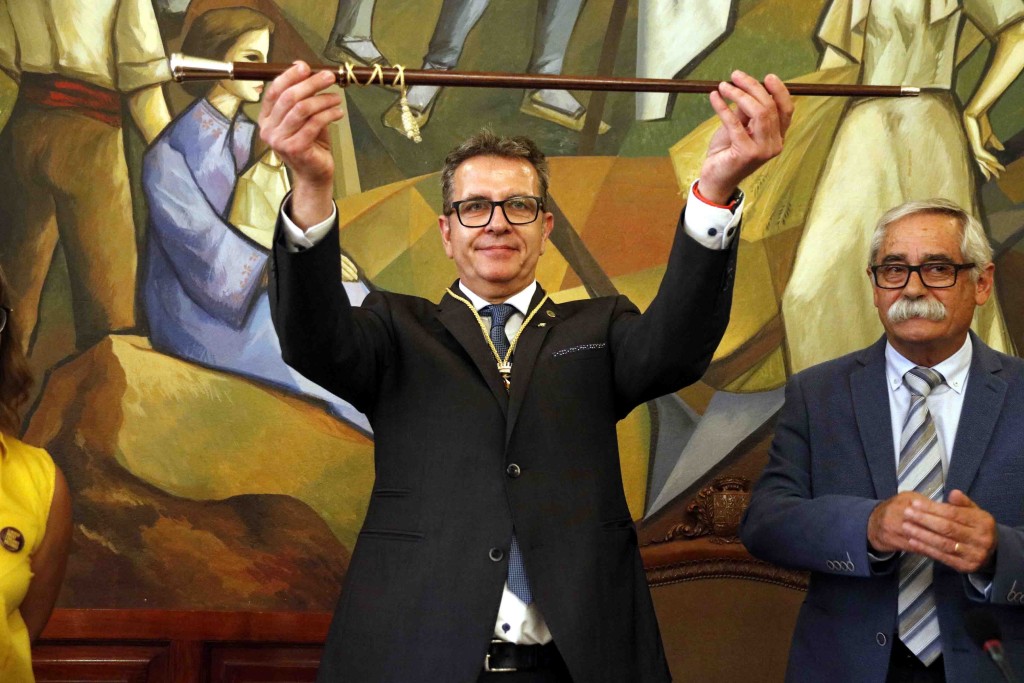 Pla mitjà on es pot veure el nou president de la Diputació de Lleida, Joan Talarn, aixecant la vara i adreçant-se al públic de la sala de plens, el 12 de juliol de 2019. (Horitzontal)