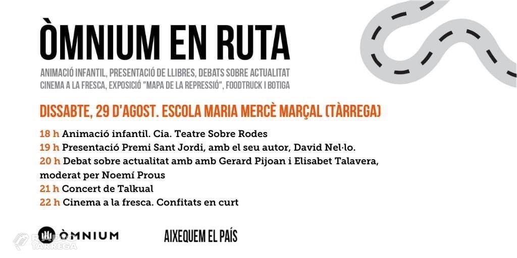 La campanya d’estiu d’Òmnium Cultural, sota el nom “Òmnium en ruta” arriba aquest proper dissabte 29 d’agost al pati de l’Escola Maria Mercè Marçal. L’entitat oferirà un tast de les diferents activitats i projectes que l’associació té en marxa de manera regular. L’equipament mòbil compta amb tres mòduls, un escenari, una furgoteca i una graderia per al públic on es garantiran totes les mesures sanitàries. També s’hi podrà veure l’exposició “El mapa de la repressió. L’acte començara a les 6 de la tarda amb un espectacle de micro-teatre destinat al públic més jove fet per dones.