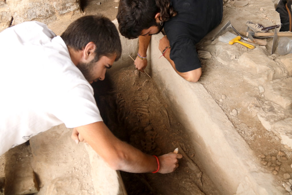 Pla mitjà on es poden veure dos arqueòlegs netejant les restes del cos de l’època tardo-romana que s’ha localitzat a la Iesso de Guissona, el 17 de juliol de 2019. (Hortizontal)