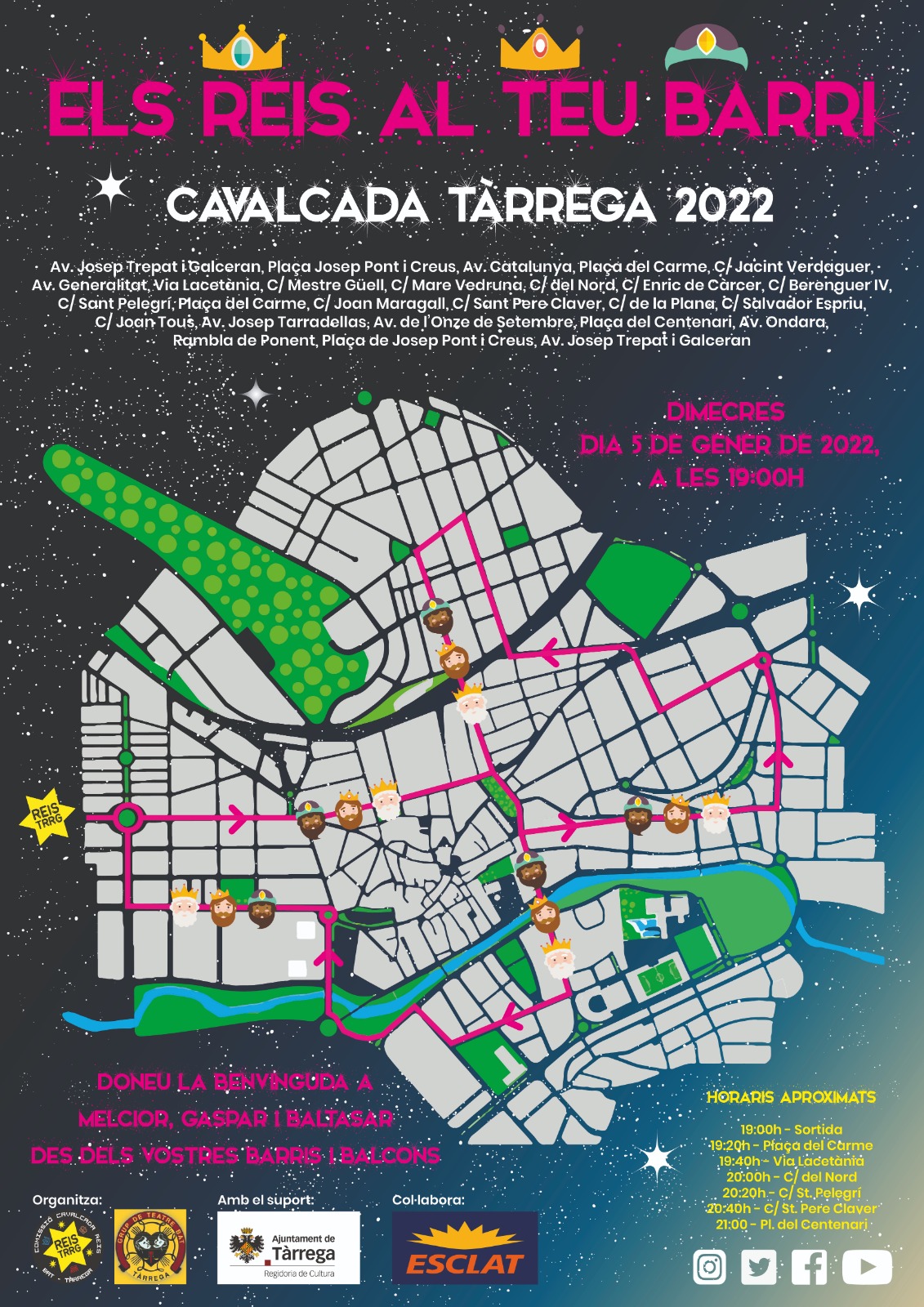 Tàrrega enllesteix els preparatius per celebrar el proper dimecres 5 de gener, a partir de les 7 de la tarda, la tradicional Cavalcada de Reis, la qual recupera enguany el format itinerant (el gener passat s’optà per fer una cavalcada estàtica). Per garantir una festa segura i evitar aglomeracions, el recorregut de la desfilada serà més llarg i s’estendrà aquesta vegada per tots els barris de la ciutat. Així mateix, es fa una crida perquè tothom dugui posada la mascareta sanitària i es respecti la distancia interpersonal. També es recomana que les famílies que resideixen als carrers per on passa el recorregut saludin Ses Majestats des dels seus habitatges. Alhora s’han anul·lat els discursos dels Reis Mags d’Orient a la plaça de les Nacions sense Estat. Com alternativa, l’alcaldessa Alba Pijuan Vallverdú lliurarà la clau de la ciutat a Ses Majestats al Museu Trepat abans de l’inici de la desfilada, moment que es podrà seguir mitjançant les xarxes socials de l’Ajuntament.