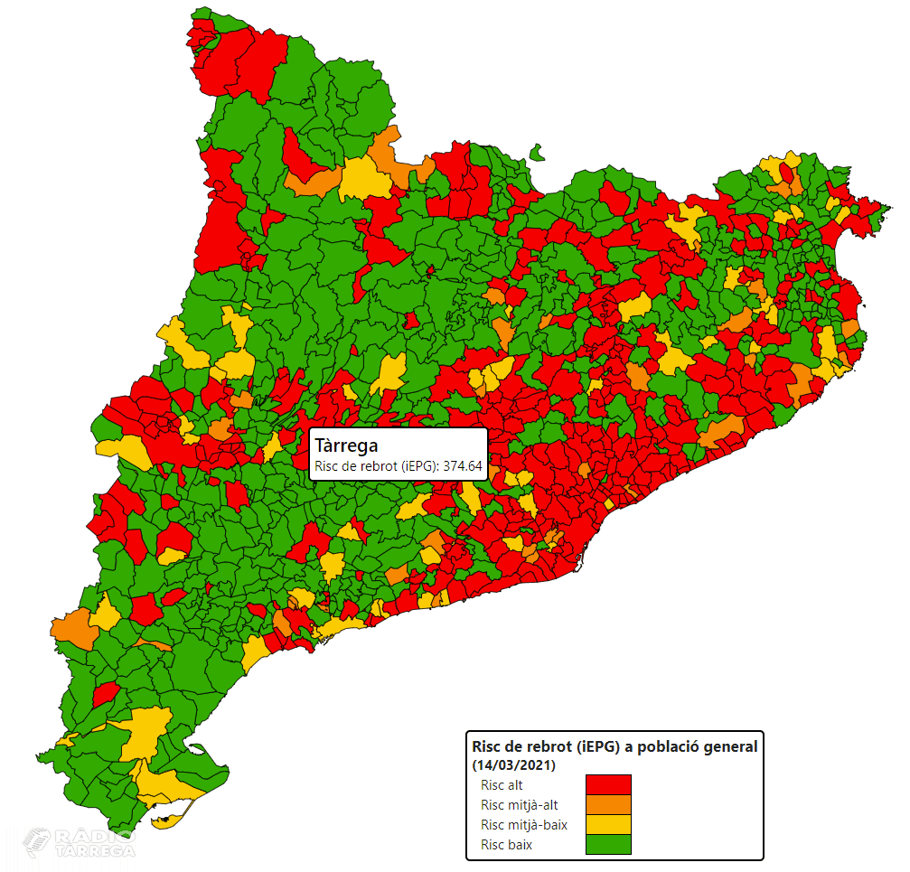 Amb relació a les dades fetes públiques a dadescovid, a la comarca de l‘Urgell, en aquests moments hi ha un risc de rebrot de 247’64 punts, amb una velocitat de propagació d’1’11. A Tàrrega el risc de contagi és de 374’64 i una velocitat de contagi de 1’31. En aquest sentit l’alcaldessa Alba Pijuan Vallverdú ha explicat que la situació a Tàrrega fa dies que no millora. Pijuan ha explicat que hi torna a haver contagis que “afecta a dos o tres famílies on s’ha contagiat tota la família”.