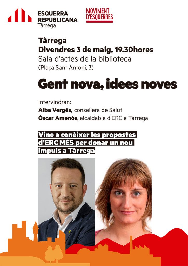 La consellera de Salut, Alba Vergés, participarà el proper divendres a l’acte “Gent nova, idees noves” on es presentaran les propostes de la candidatura d’Esquerra Republicana de Catalunya – Moviment d’Esquerres (ERC-MES) a l’Ajuntament de Tàrrega. Vergés ha vlgut així mostrar el seu suport a la candidatura republicana a la capital urgellenca, un equip renovat que ha estat recollint propostes ciutadanes els darrers mesos per confegir el seu programa electoral. A l’acte, també hi participaran l’alcaldable d’ERC-MES, Òscar Amenós, i la número 2 de la candidatura, Alba Pijuan Vallverdú. La candidatura valora de manera molt positiva la resposta ciutadana que els ha fet arribar propostes i comentaris per millorar la ciutat. L’acte d’aquest divendres és obert a tothom i tindrà lloc a les 19.30h a la sala d’actes de la Biblioteca, a la plaça Sant Antoni, 3 de Tàrrega. L’equip d’ERC-MES també es va poder reunir el passat dissabte 27 d’abril amb el conseller d’Educació, Josep Bargalló, per intercanviar impressions sobre la situació educativa de la ciutat.