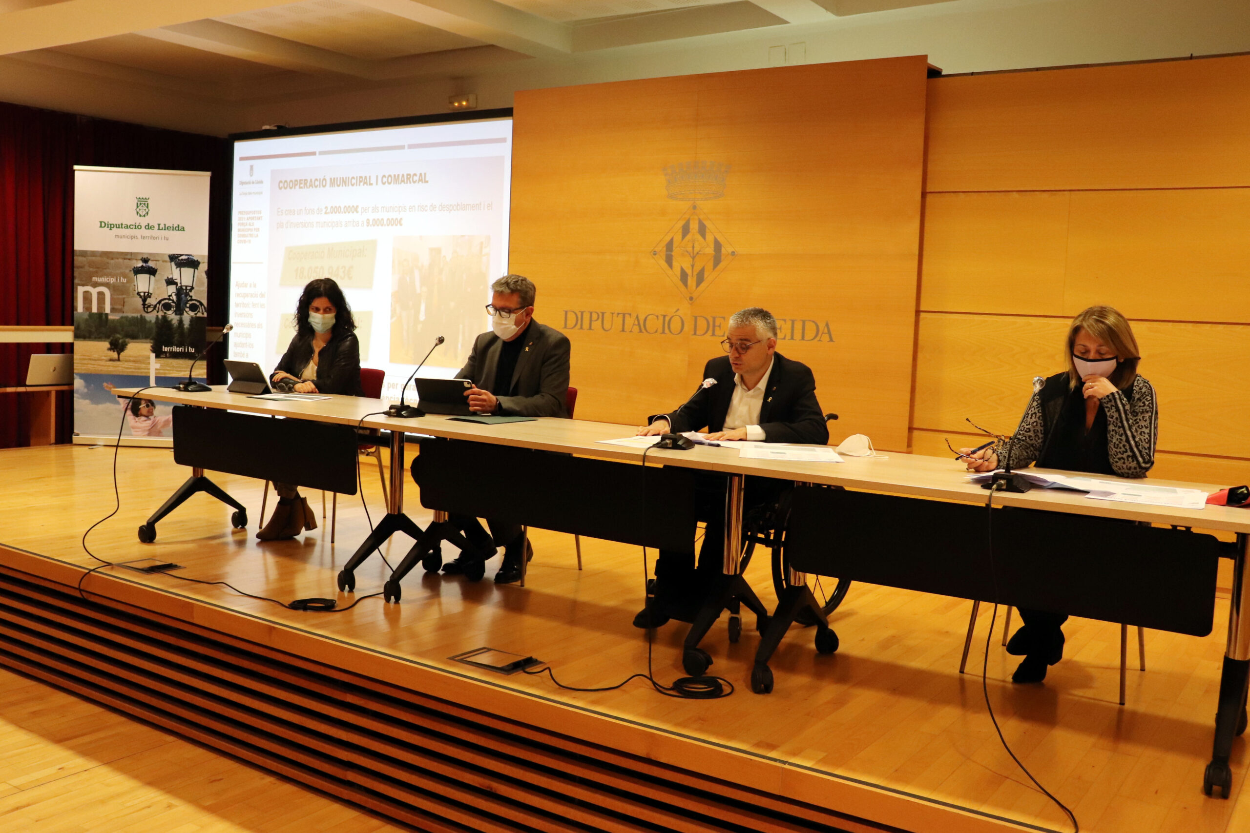 La Diputació de Lleida activarà diferents partides que sumen 12.480.376€ en els pressupostos de l’any 2021 per ajudar a revertir els efectes socioeconòmics negatius de la Covid-19, segons s’ha informat aquest matí en la presentació del projecte dels Pressupostos per a l’exercici vivent. El president de la Diputació, Joan Talarn, i el vicepresident primer, Jordi Latorre, acompanyats per les portaveus dels grups de govern, ERC i JxCat, Mercè Carulla i Rosa Pujol, han fet públic el projecte de pressupostos el mateix dia en què s’inicia la negociació amb els grups de l’oposició. Per al govern de la Diputació de Lleida, l’objectiu fonamental d’aquests pressupostos és prioritzar accions que ajudin a pal·liar els efectes negatius de la Covid-19, tant per part de la pròpia Diputació com dels ajuntaments i consells comarcals, així com de les entitats que reben suport financer de la Diputació.
