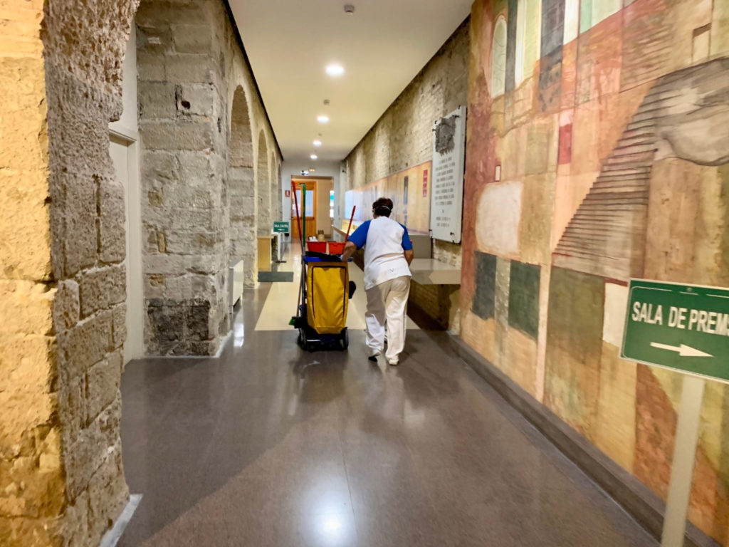 Una dona neteja i desinfecta les sales de l’edifici del Palau de la Diputació de Lleida. Imatge del 23 de març de 2020. (Horitzontal)
