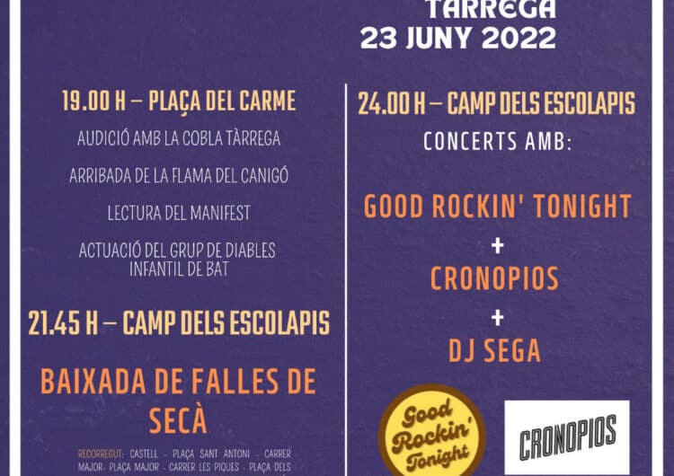 La vetllada per donar la benvinguda al Solstici d’Estiu continuarà a 3/4 de 10 de la nit amb una “Baixada de Falles de Secà”, una proposta introduïda l’any 2019 que recrea les baixades en fila de teies enceses al Pirineu. La baixada començarà al Castell de Tàrrega i recorrerà el casc antic de la ciutat. Prèviament a la tarda en un taller adreçat a les entitats de la ciutat, aquestes forjaran la teia mitjançant un treball col·lectiu. El descens culminarà a les 10 de la nit al Camp dels Escolapis amb l’encesa de la foguera. Prendrà el relleu el sopar popular al preu de 9 euros (venda de tiquets a La Botiga del Museu). La nit més curta de l’any s’engalanarà també amb un doble concert protagonitzat per les formacions Good Rockin’ Tonight (versions) i Cronopios (latin, hip hop i funk) seguides de l’actuació de DJ Sega (música ballable).