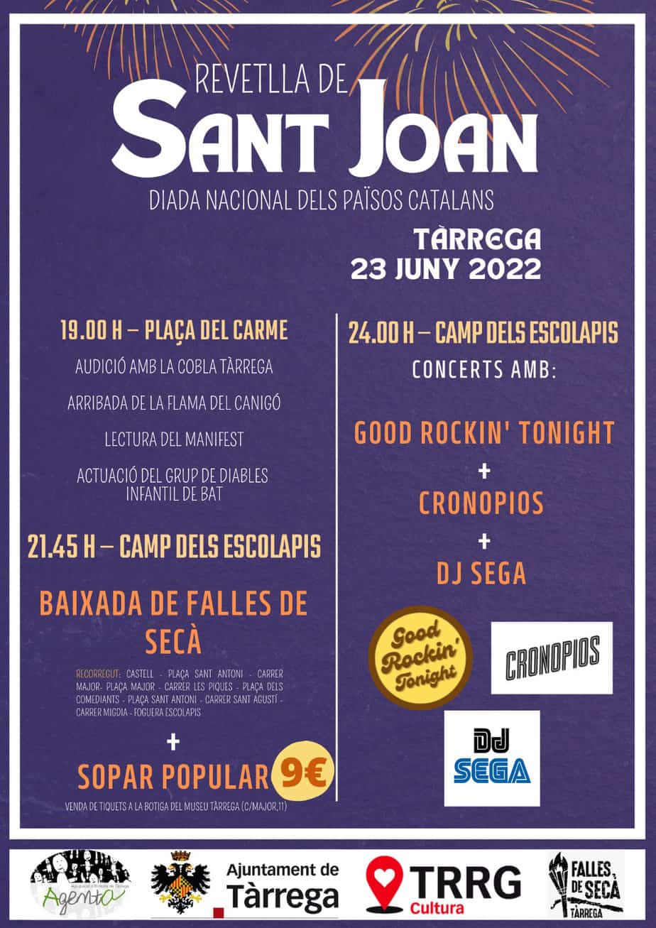 Tàrrega celebrarà el dijous 23 de juny la tradicional Festa de Sant Joan recuperant al 100% el format habitual de la revetlla després de dues edicions marcades pels protocols sanitaris. Així doncs, enguany la rebuda de la Flama del Canigó es tornarà a celebrar a la plaça del Carme mentre que el sopar i els concerts tindran lloc al Camp dels Escolapis. Agenta i la Regidoria de Cultura apleguen esforços de nou per oferir una lluïda festa que conjugarà tradició, color i convivència..