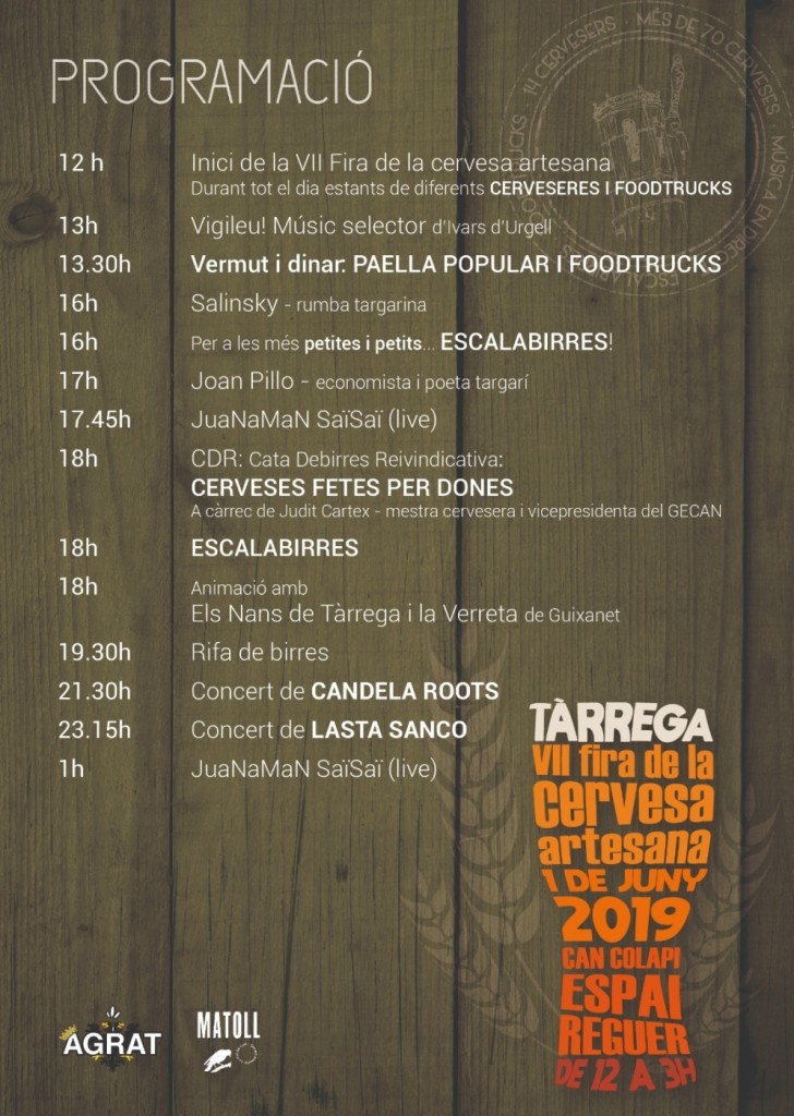 Un altre dels plats forts de la 7a Fira de la Cervesa Artesana de Tàrrega serà la gran quantitat de concerts gratuïts amb grups musicals i DJ’s diferents que amenitzaran les 15 hores de certamen. Durant el dia hi haurà les actuacions de Salinsky amb rumba targarina (16h), l’economista i poeta targarí Joan Pillo (17h), la sessió de JuaNaMaN SaïSai (17.45h) i l’animació dels Nans de Tàrrega i la Verreta de Guixanet. Finalment, a la nit, hi haurà un concert amb dos grups. A partir de les 21.30h actuaran els Candela Roots, un grup de música reggae en valencià amb vocació reivindicativa i que aposten perquè les dones tinguin un paper més protagonista en el món de la música, i posteriorment serà el torn dels Lasta Sanco, un grup cerverí que presenta el seu primer disc i que es caracteritza pel mestissatge d’estils amb base electrònica, influenciats per grups com Bomba Estéreo, Dub Inc o Zoo. A més, també hi haurà un ampli espai de jocs infantils per als més menuts i s’organitzarà el tradicional ‘Escalabirres’ conjuntament amb l’Agrupació Excursionista de Tàrrega.